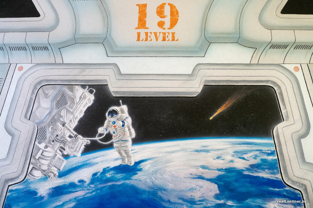 Onliner продолжает рассказывать про минские подъезды и то, как их меняют жильцы. В прошлый раз мы любовались подъездом-будуаром с тяжелыми портьерами и картинами в Лебяжьем. Теперь посмотрим на современный стиль оформления мест общего пользования. Дело происходит в панельной многоэтажке на улице Нестерова, 96. На 19-м уровне (недалеко от стратосферы) минчане устроили настоящий космос: здесь корабли бороздят просторы Вселенной, бравые парни в специальных костюмах следят за входящими-выходящими, а обрамление лифта навевает тревогу.