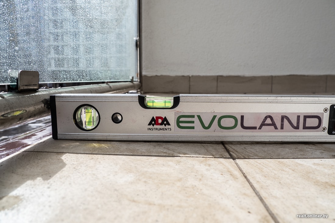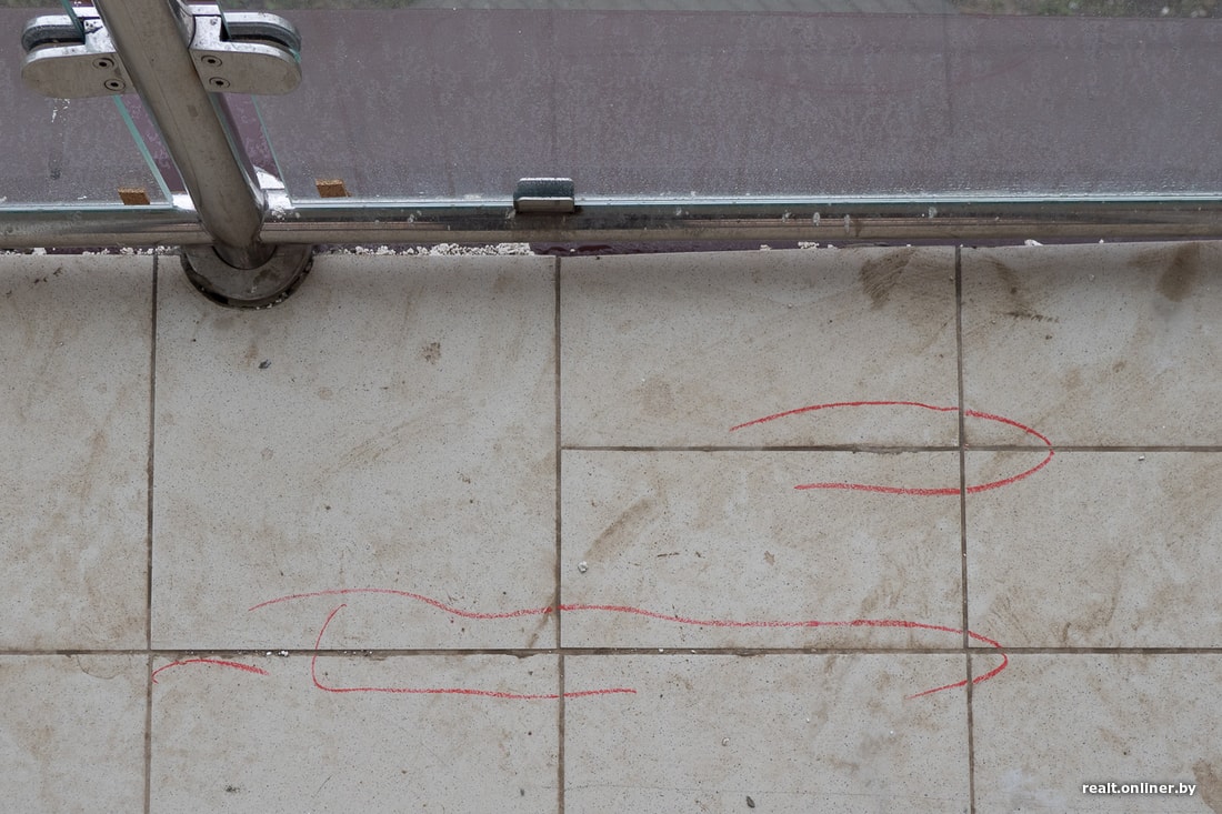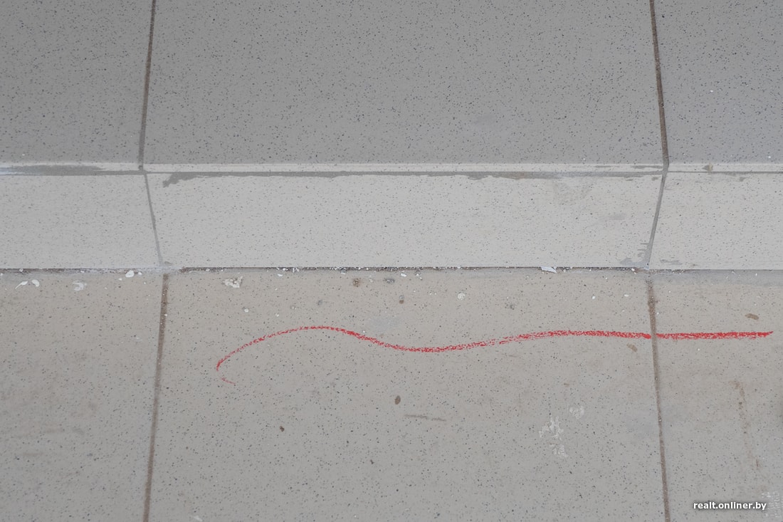 Самое любопытное — это терраса: сделали ли ее на пятерочку? Дмитрий с ходу разочаровывает: претензии есть, хотя и не столько, как уже доводилось видеть. Из бросающегося в глаза — сколы на плитке, непрофугованные швы и наплывы раствора по швам. Но самое неприятное — локальный контруклон плитки. То есть попавшая на террасу вода будет скапливаться на полу (запасайся швабрами или заставь застройщика сделать нормально).