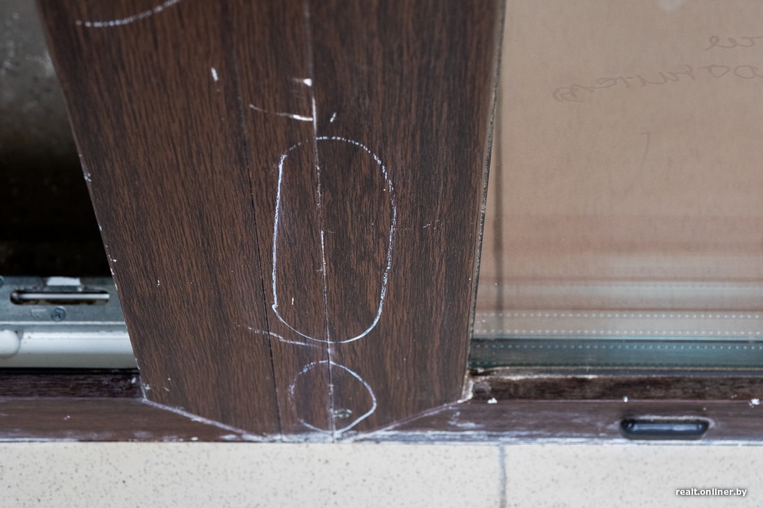 — С окнами все плохо: очень много повреждений на рамах и стеклопакетах, — переходит к конкретике Дмитрий. — По-хорошему, дольщик вправе требовать замену всех стеклопакетов. Причин для этого предостаточно: царапины, «выколки» (углубления, оставшиеся, скорее всего, после того как со стекол вручную удаляли окалину). При этом сами по себе окна хорошие по качеству, профиль даже лучше, чем устанавливали в соседних «Маринах». То есть их испортили уже люди, которые тут работали.