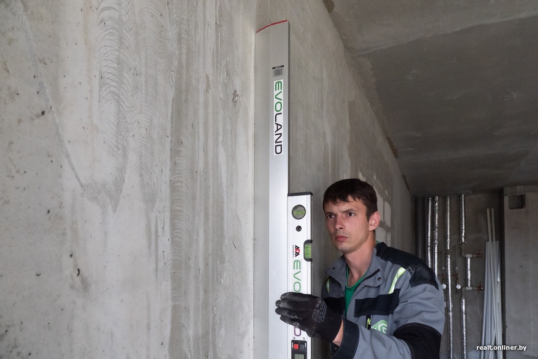 — Что касается стен, то все выполнено довольно неплохо. Плоскость по монолитным конструкциям и кладке выдержана. Это было понятно при внешнем осмотре, подтвердилось и после проверки правилом. Даже больные места, где идет стык разнородных материалов, выведены в один уровень. Нет таких переломов, которые заставляют потом накладывать слои штукатурки, чтобы получить одну плоскость.