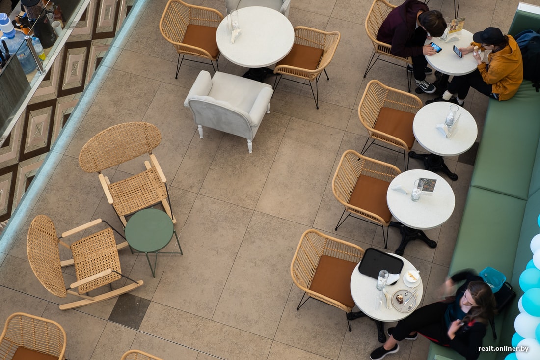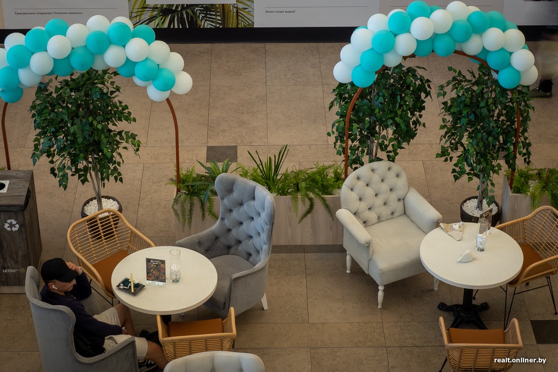 В зоне посадки Leto Organic Bar установлено 12 столов, за каждым из них может поместиться от двух до четырех человек. Для особо уставших предусмотрены кресла-качалки. Попозже, обещают, появятся подвесные кресла-гамаки.
