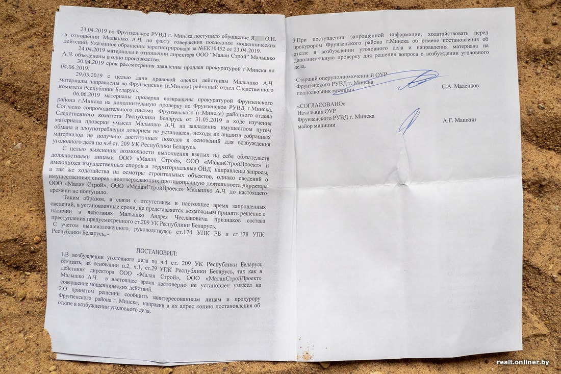 В сентябре 2018-го минчанин обратился в суд, чтобы с помощью Фемиды вернуть свои деньги. После долгих споров и утомительных заседаний стороны пришли к мировому соглашению, согласно которому «Малан Строй» должен вернуть Антону внесенные средства, оставить объект и выплатить небольшую компенсацию — как говорится, бумага все стерпит. Понятно, что ничего из этого не произошло. Судебные исполнители, к которым позже обратился минчанин, тоже не помогли: счета «Малана» оказались пустыми, имущества ноль, а значит, и взыскать нечего.