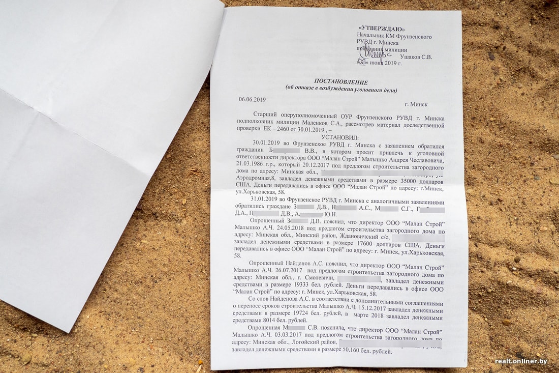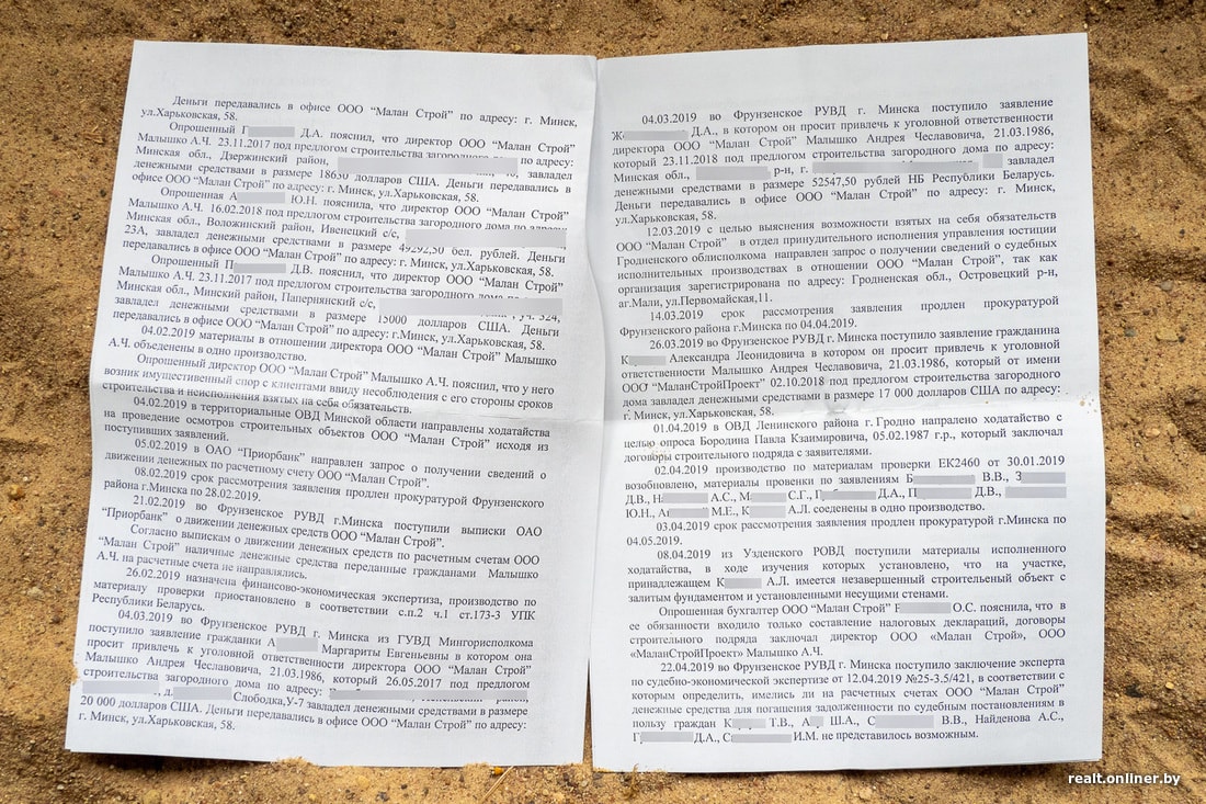 — Где-то в 2018 году обманутые клиенты «Малан Строя» начали объединяться. В группе в Viber нас сейчас почти 20 человек, — говорят минчане. — И это, думаем, еще далеко не все пострадавшие. Плюс есть юридические лица (в том числе известный застройщик), которые не хотят заявлять о себе, чтобы не позориться. По нашим скромным прикидкам, только на предоплатах «малановцы» могли насобирать $500 тыс. (Повторимся, что к правоохранителям обращались далеко не все: одни не верят в правосудие, другие не хотят светиться.)