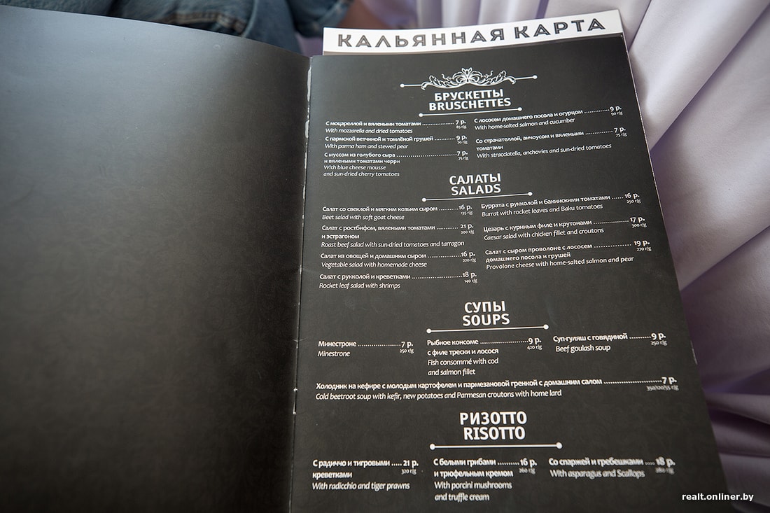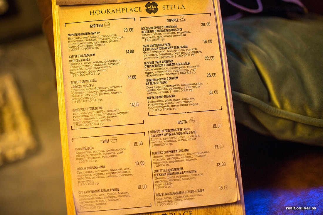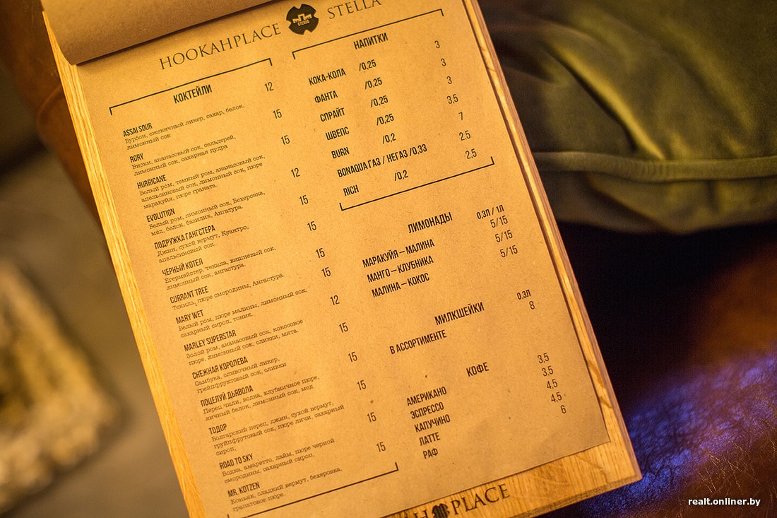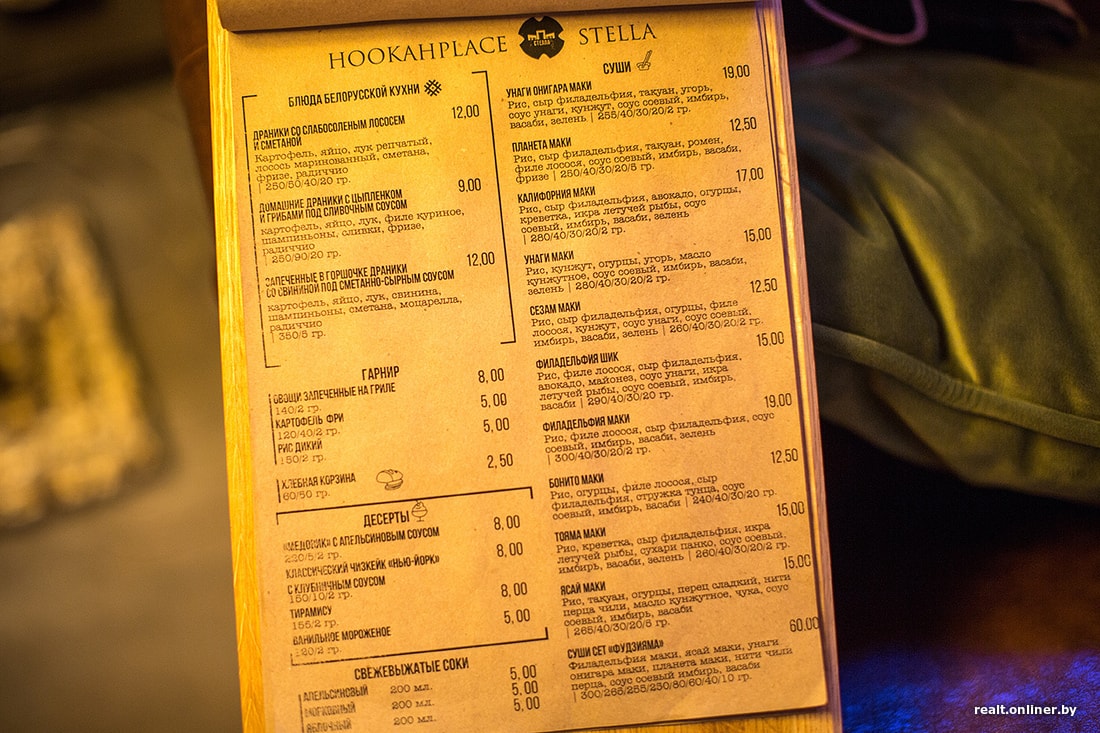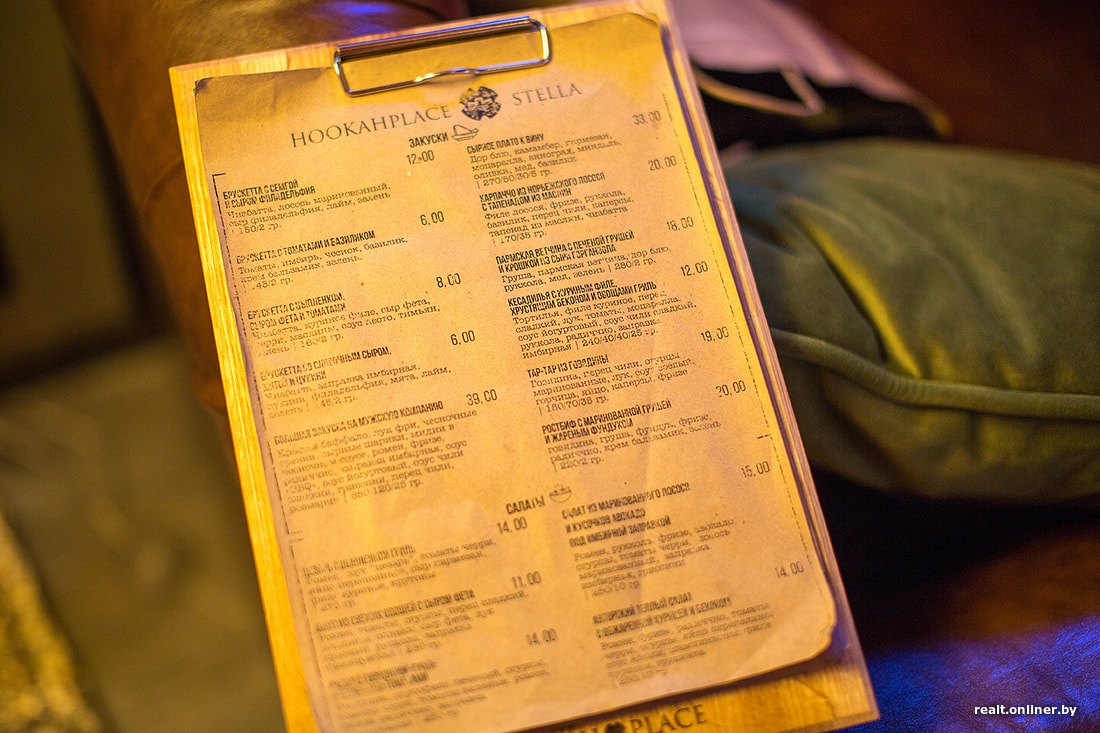 Часто случается, что в кальянных совершенно не беспокоятся о кухне — еду в некоторых местах невозможно есть, она невкусная. Удивило то, что здесь есть белорусская кухня, надо будет попробовать.