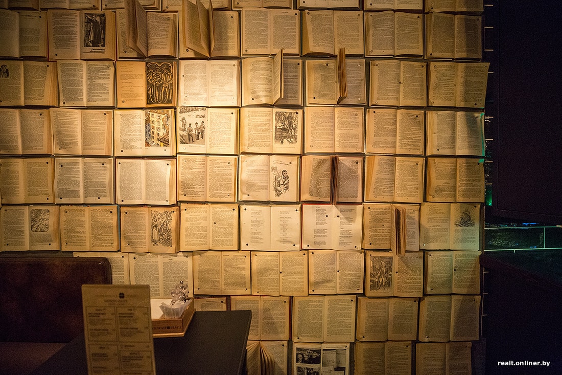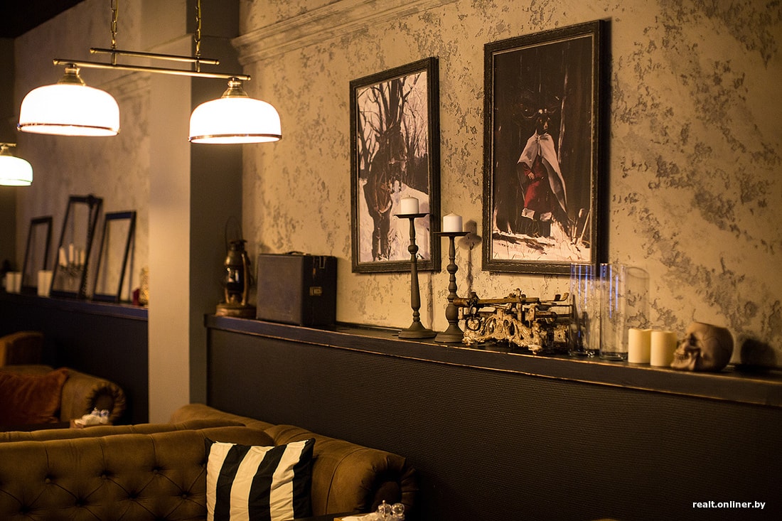 Интерьер очень темный и дымный — классика для кальянных. Запоминается стена, обклеенная книгами, камин, обставленный всякими старинными вещами, и черепа повсюду.