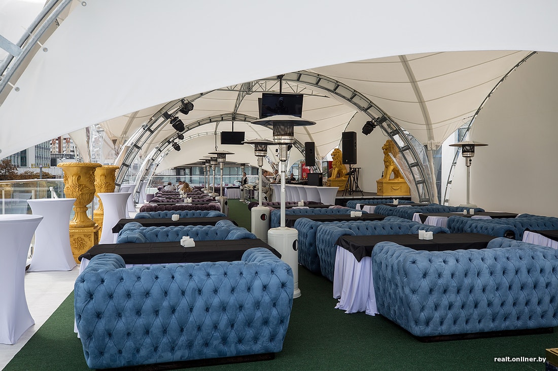 Давно в Минске не открывались пафосные места, где вечером девушек ждут только на каблуках. И вот Terrace Secret Rooms заполнил пробел. Место выбрали неожиданное — на террасе Дворца спорта. Сейчас уже и не вспомнишь, что там вообще было до этого. Крышу заменяет белый тент — он и есть ориентир.