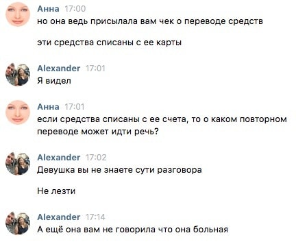 «Даритель» подчеркивает, что карта зарегистрирована на его имя, которое совпадает с именем, указанным на странице во «ВКонтакте». На самом деле узнать имя владельца Qiwi-кошелька можно только с санкций правоохранительных органов, в других случаях банковская система Qiwi не выдает данные своих пользователей. Переписку с обеими жертвами мужчина вел 14 августа. Татьяна перевела ему 50 рублей, Дмитрий — 30. Получив деньги на свой Qiwi-кошелек, «даритель» вел себя по-разному, но в обоих случаях требовал новых денег.