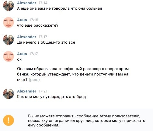 Отвечая на вопросы Onliner, мужчина был ничуть не изобретательнее, чем в разговоре со своими жертвами: уверял, что деньги затерялись где-то в проводах между счетом отправителя и получателя и для того, чтобы платеж прошел, следует повторить операцию. Затем потребовал не лезть в это дело и в качестве эффектного финала ограничил отправку сообщений.