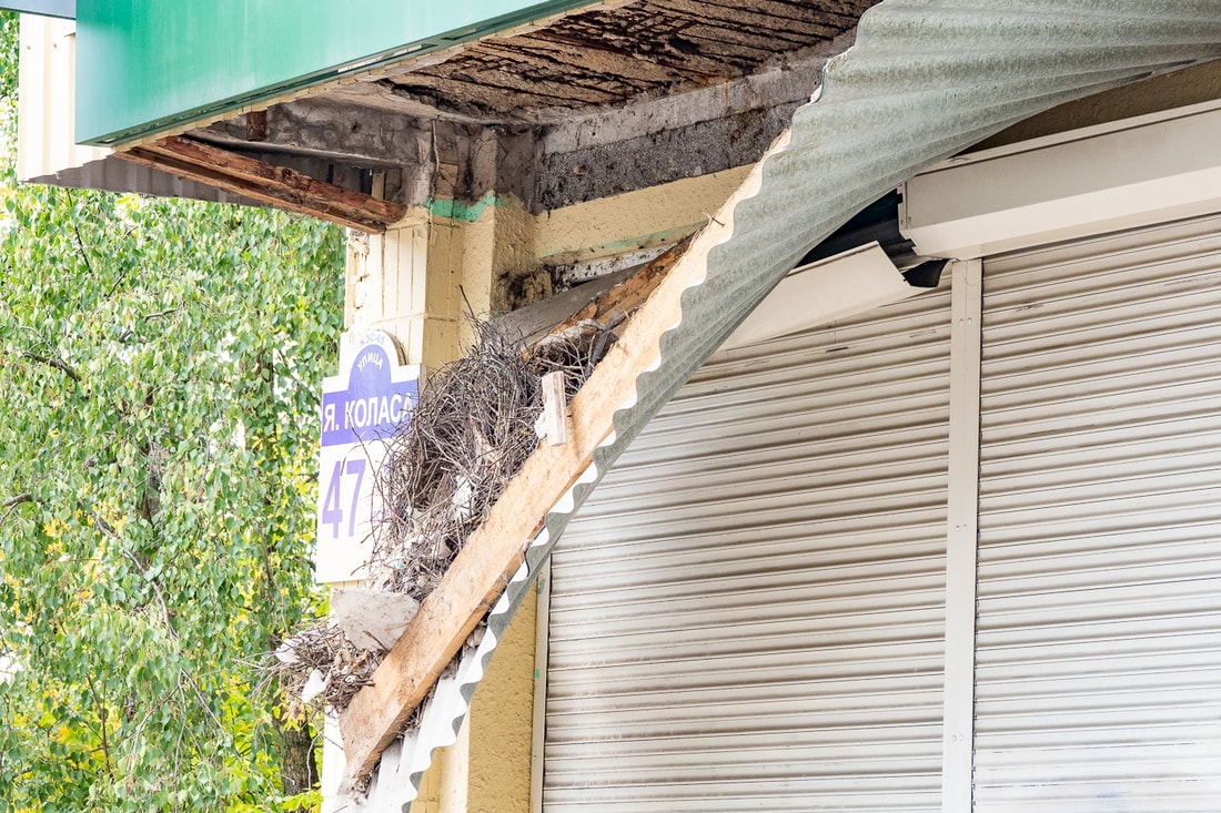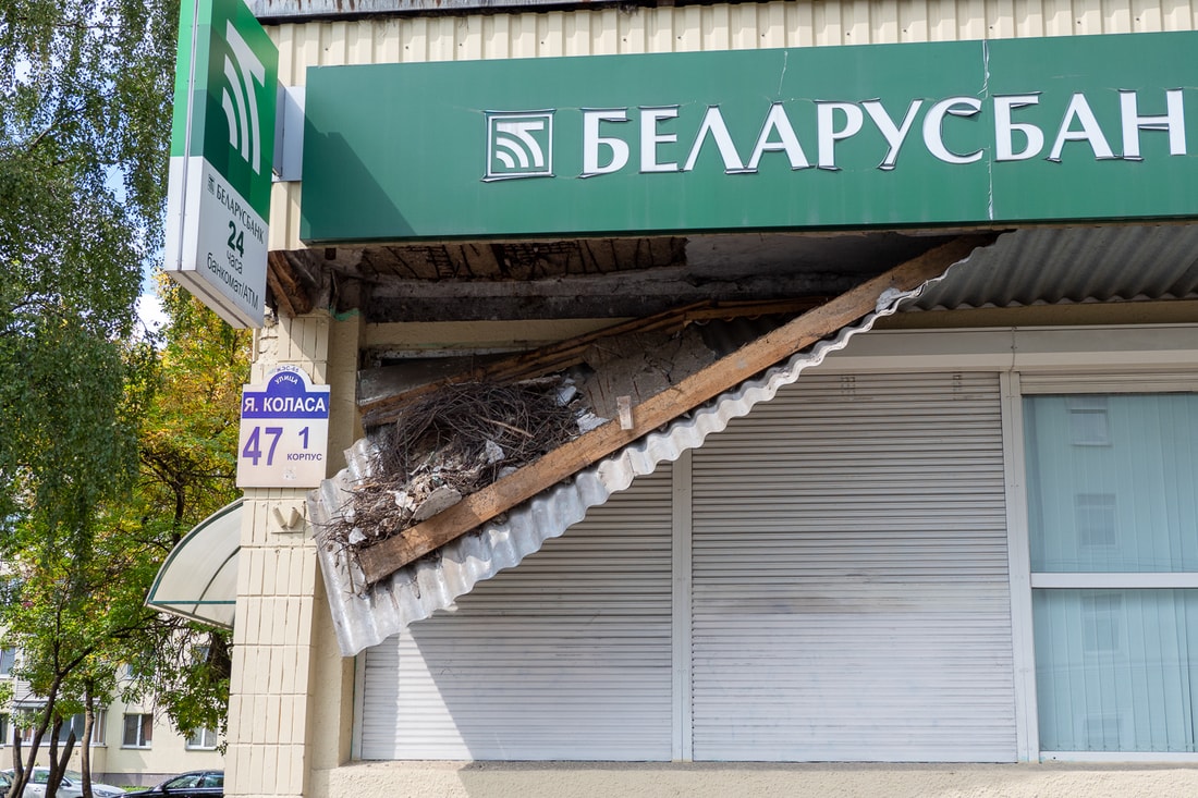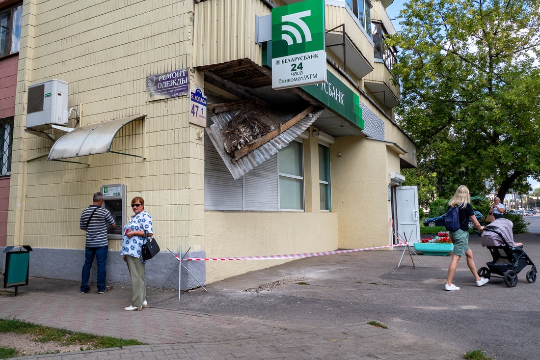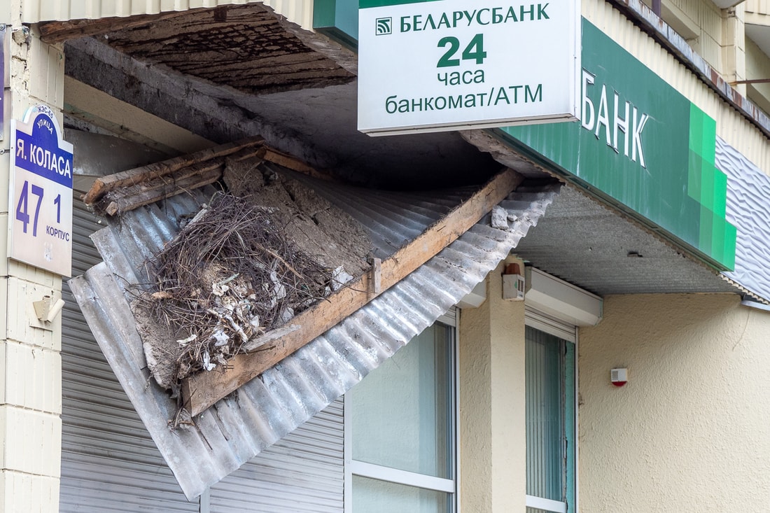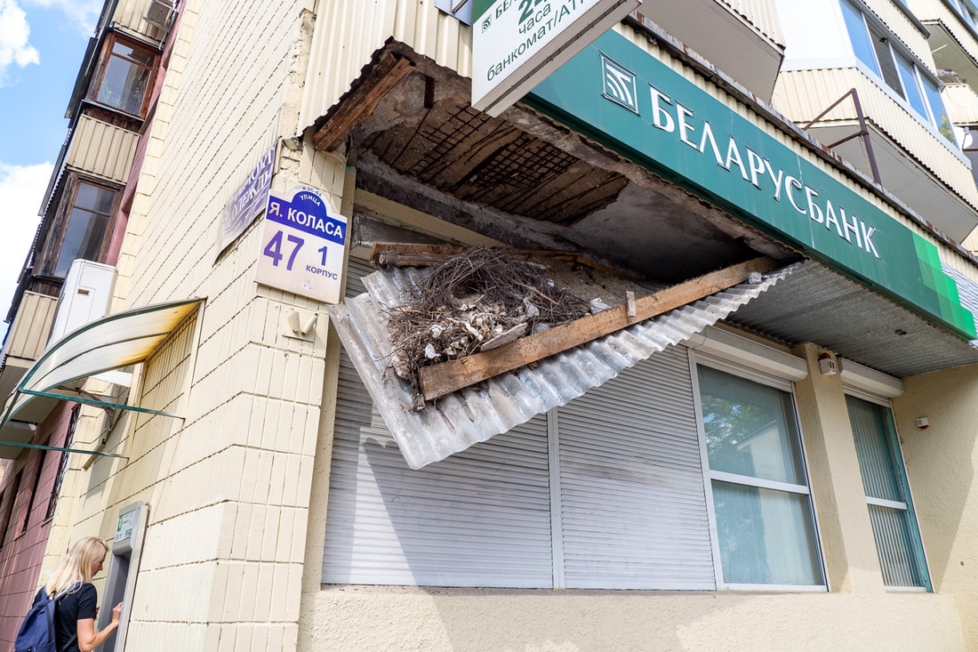 В Минске на ул. Якуба Коласа, 47/1, обвалилась часть балкона под вывеской «Беларусбанк». От балконной плиты отстал кусок металлопрофиля и самой плиты, обнажив арматуру. Опасная конструкция, свисающая с балконного перекрытия, отгорожена лентой от пешеходной зоны.