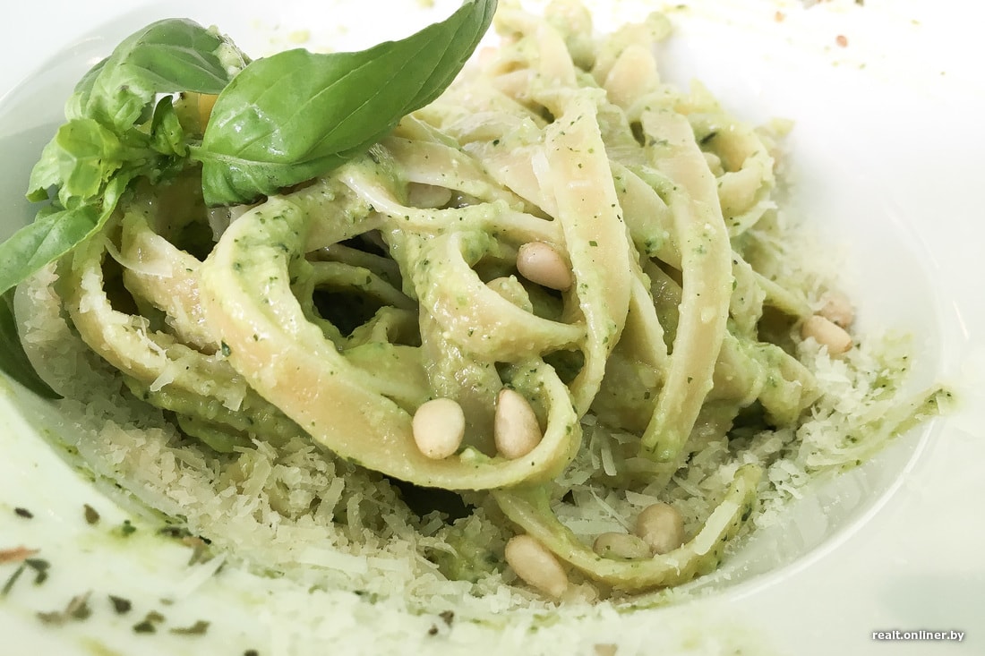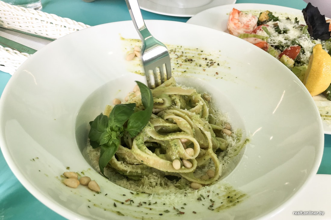 Было решено заказать пасту «Феттучини аль песто из цуккини». Во-первых, это красиво. Макарошки в обильном зеленом соусе, посыпанные кедровыми орешками и тертым сыром. И все это в большой ресторанной тарелке. Правда, красиво. Состояние пасты — слегка не альденте, но на вкус и цвет… Вкус крайне необычный: сильно чувствуется мята. Со мной такое впервые: макароны с мятой. Сомнительно, но вы попробуйте и сформируйте свое мнение.