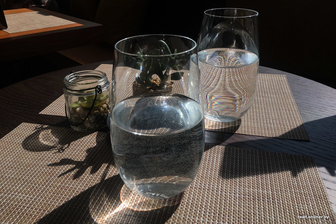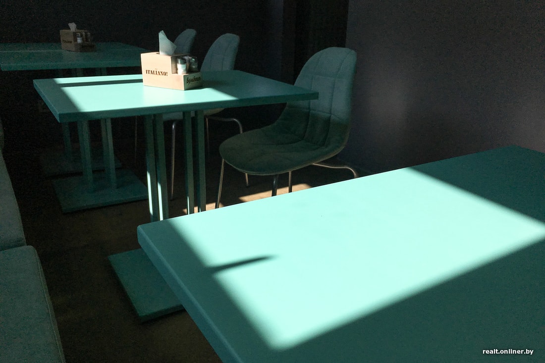 Интерьер простой. Да, именно простой, потому что бетонные стены, велюровые кресла и много дерева — это, можно сказать, уже классика для минских заведений. Даже «Евроопт» и прочие сети делают похожие торговые залы. Хотя, конечно, если говорить про аутентичные итальянские заведения, то их простота заключается в голых белых стенах и старенькой мебели. Но мы не в Италии.