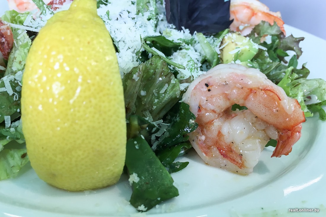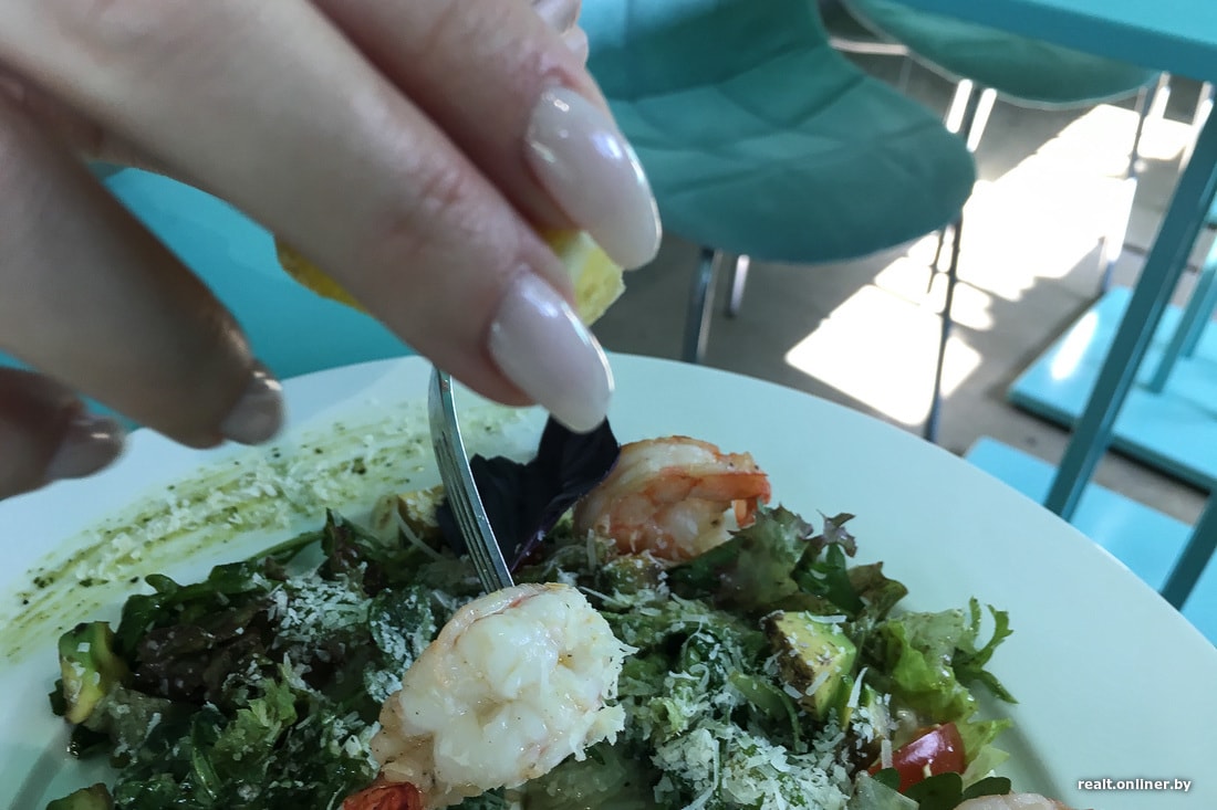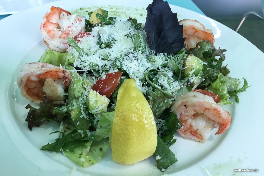 С салатом угодили. Упругие, довольно большие креветки, мягкое авокадо, насыщенный соус. Но зелень была уже не хрустящей, будто лежала пару дней в холодильнике.