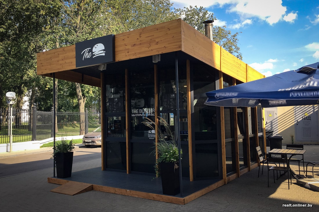 The Burger — это киоск в современном стиле возле бизнес-центра Kiroff Center. Его построили с нуля, рядом поставили столы и стулья, но к зиме уберут.
