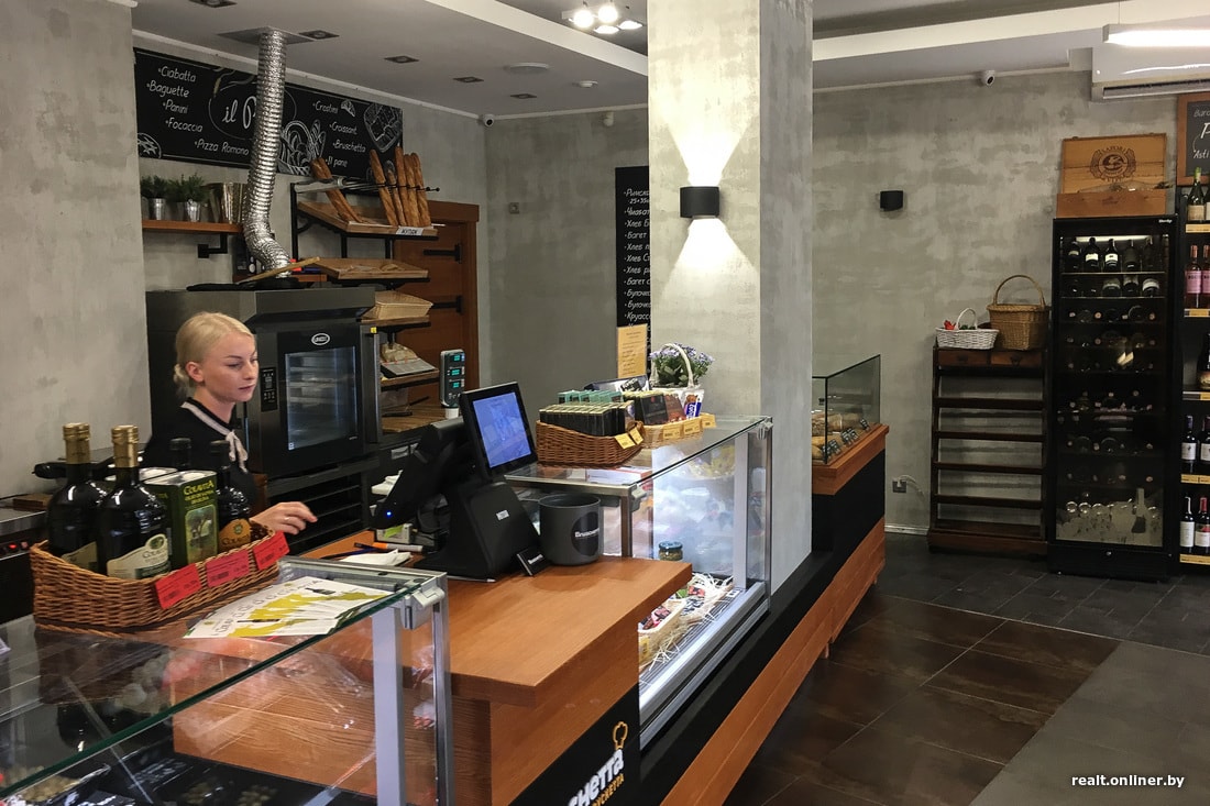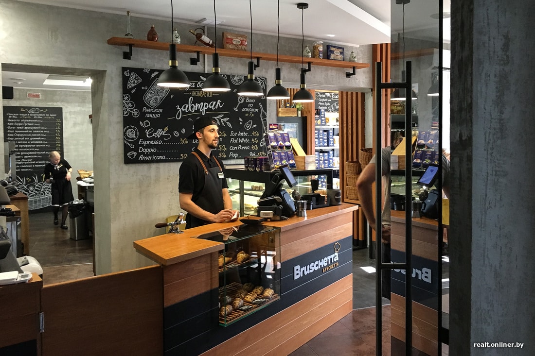 Итак, Bruschetta — гастролавка, где можно и посидеть с бокалом вина, и поесть, и купить провизии с собой. Помещение разделено на бар с пирожными, магазин и кафе.