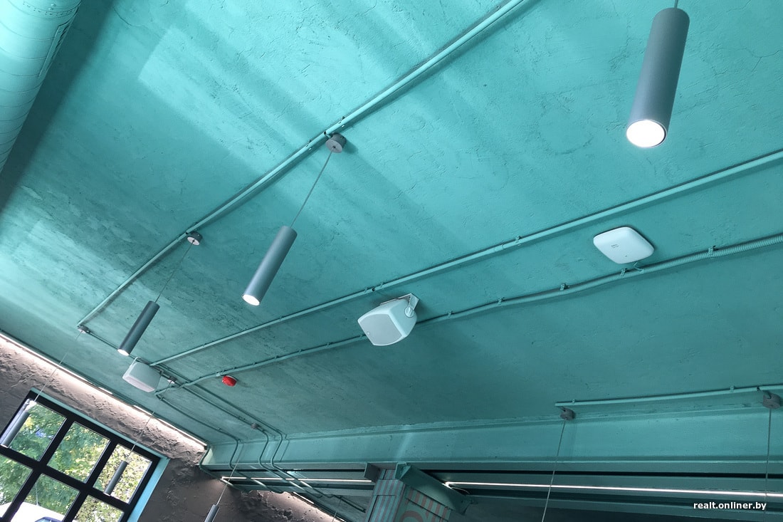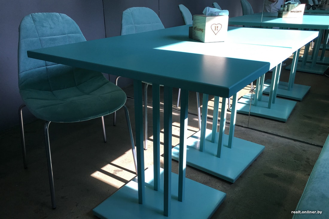 Интерьер прямо очень крутой. Весь такой мягкий, легкий, мятный, разнообразный. Грубая фактура стен, неровная кирпичная кладка, покрашенная в нежный цвет — хорошее решение. Есть зеркала, в которых можно сфоткаться, а сзади отразится красота цвета тиффани. Дружелюбный к Instagram интерьер. Зонирование классное — можно сесть и в уединении, и напоказ, и так, чтобы видеть все вокруг.
