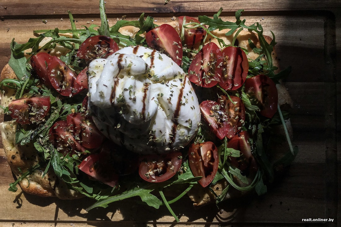 А вот и блюдо с бурратой. Этот сыр из молока буйволицы и коровы, кстати, тоже любят гурманы. Обычно мешочек этого сыра подают с помидорами и базиликом. Тут добавили еще основу из фокаччи. Блюдо превратилось из закуски в основное. Сытно, и правда очень вкусно. За буррату респект.