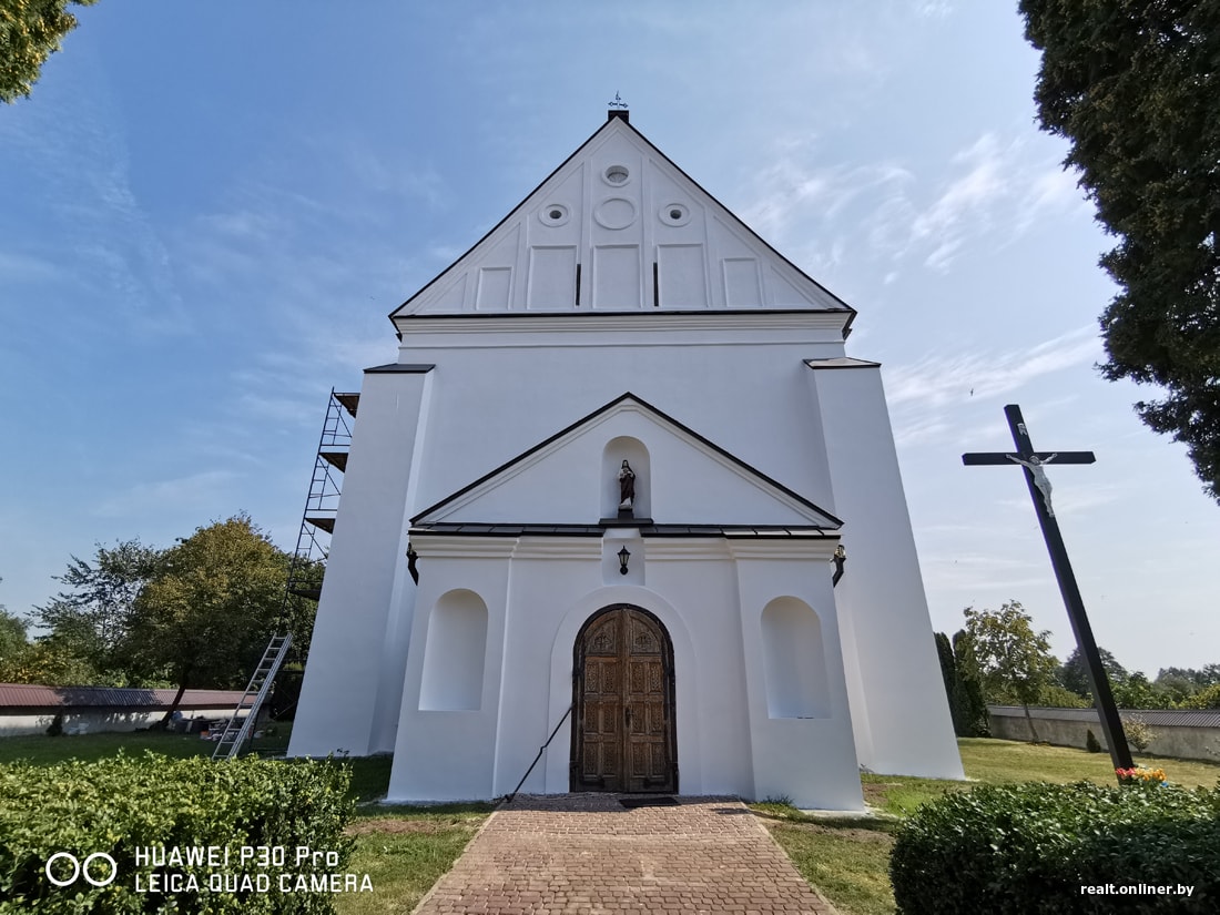 Розово-белый, легкий и воздушный костел похож на праздничный торт. Строительные леса давно сняты, но здание пока не действует.
