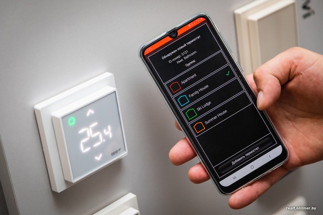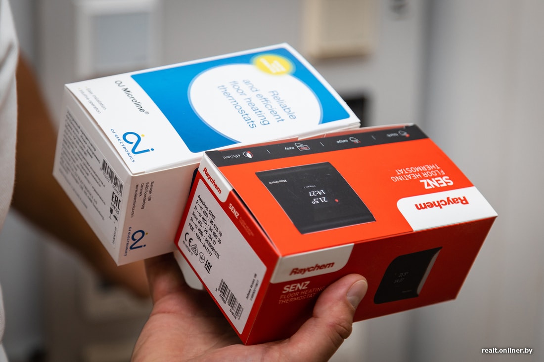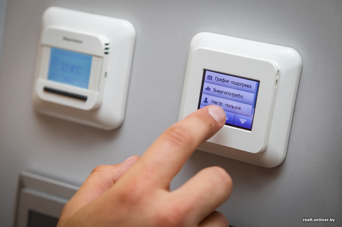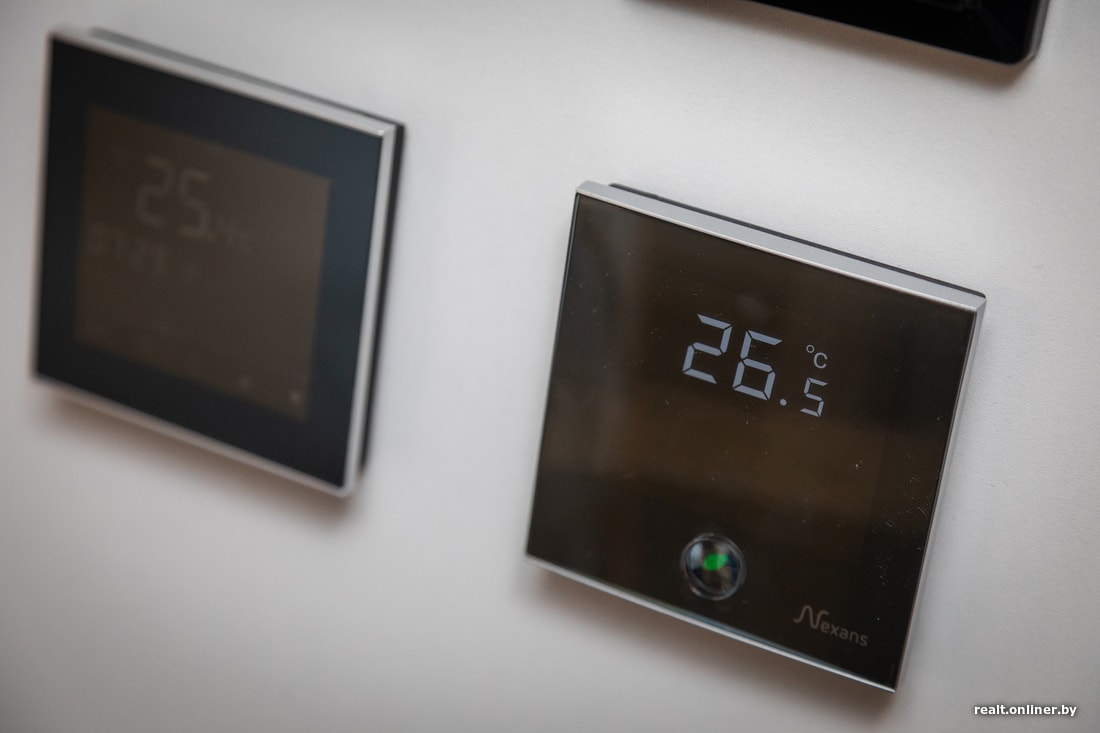 Покупка теплого пола — это еще полдела и полцены. Без терморегулятора все это добро не работает. Так что потратиться придется еще и на «умное» окошко в стене, которое можно подобрать в тон розеткам и выключателям.
