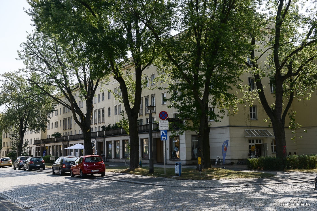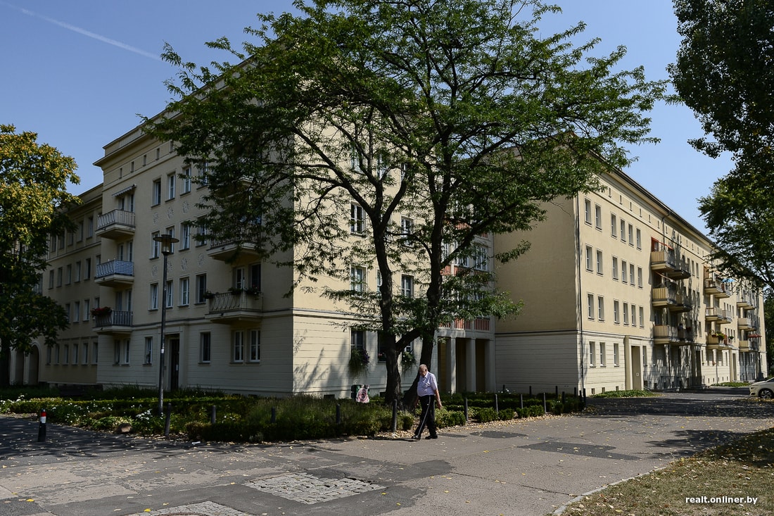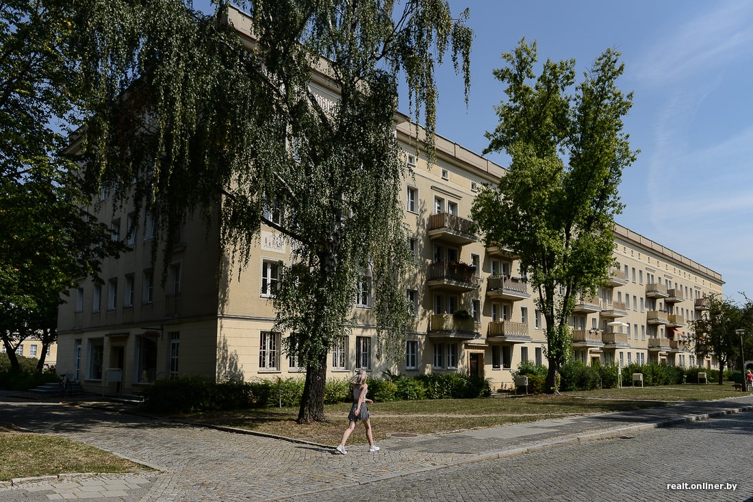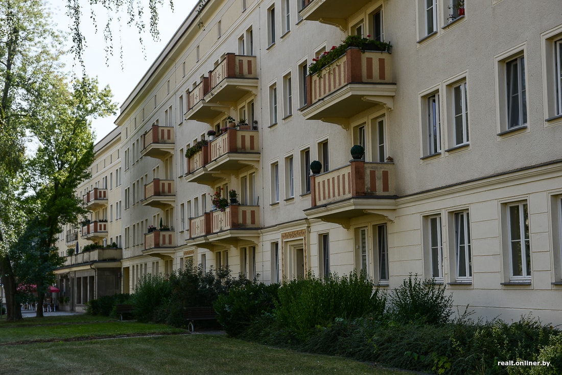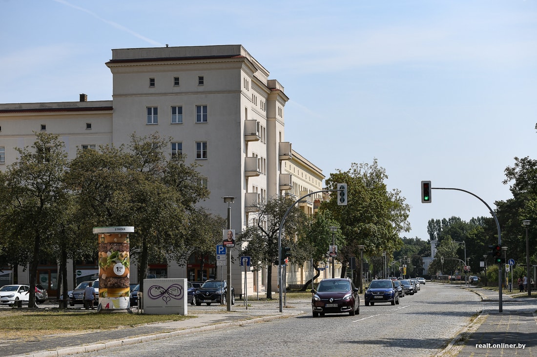 Вокруг площади и проспекта создавалась сетка кварталов, по периметру застроенных парадными жилыми домами, архитектура которых отличалась в деталях, но не в своей утопической сути. Богатый (для Германии, но не для Советского Союза) классический и ренессансный декор, развитая инфраструктура с магазинами, кафе, школами и детскими садами, просторные и хорошо озелененные дворы — для еще лежавшей в руинах страны это было революционно, уникально и должно было зримо пропагандировать неминуемо ожидающее всех немцев светлое будущее — особенно на фоне народных волнений 1953 года в ГДР.