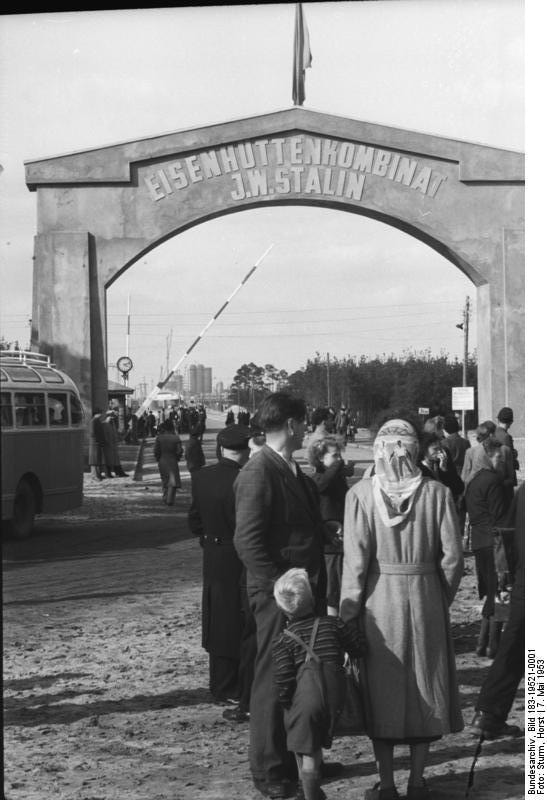 Все это возводилось, впрочем, не от хорошей жизни. После Второй мировой войны практически вся крупная металлургическая промышленность Германии оказалась сначала в западной зоне оккупации, а затем и в составе ФРГ. Альтернативная Германия, ГДР, осталась, по сути, без стали, а без нее решать важные вопросы социалистического строительства было как-то не очень удобно. В июле 1950 года в Берлине состоялся III съезд СЕПГ (местный вариант компартии), на котором было принято решение о создании в стране плановой экономики. Одной из важнейших задач первой пятилетки, помимо прочего, стало возведение в ГДР нового образцового металлургического комбината, будущего флагмана возрождающейся черной металлургии идеологически верной Германии.