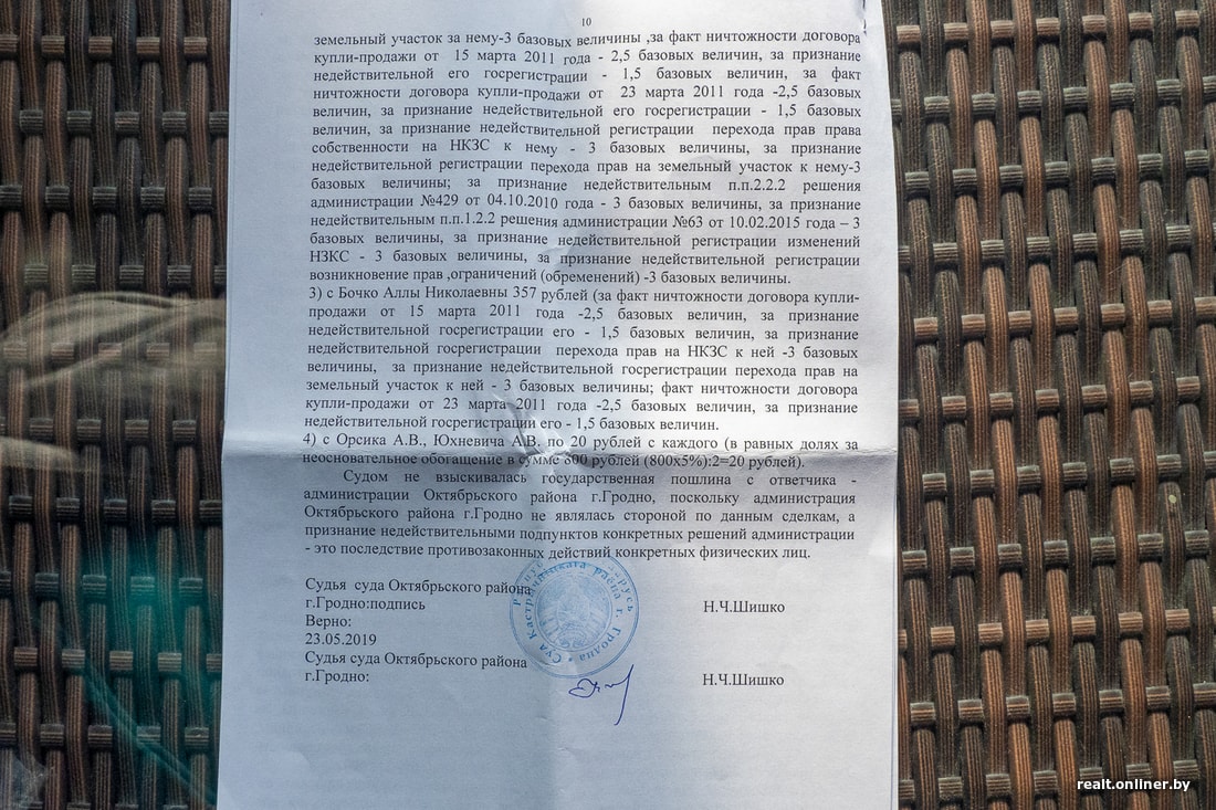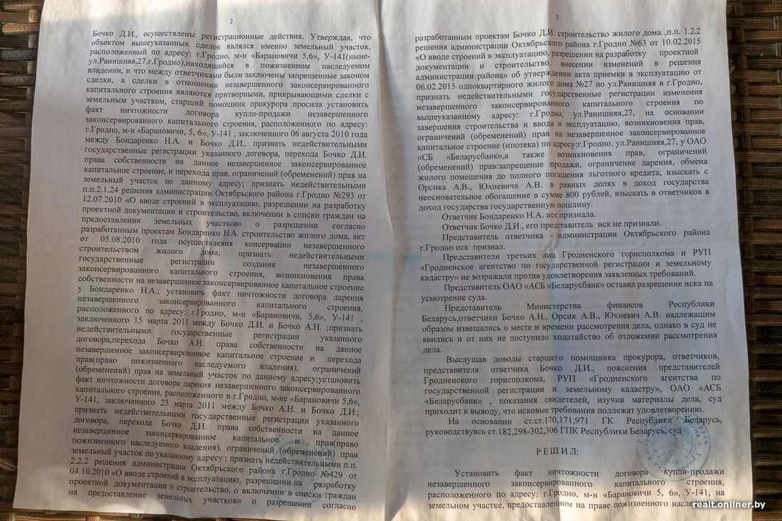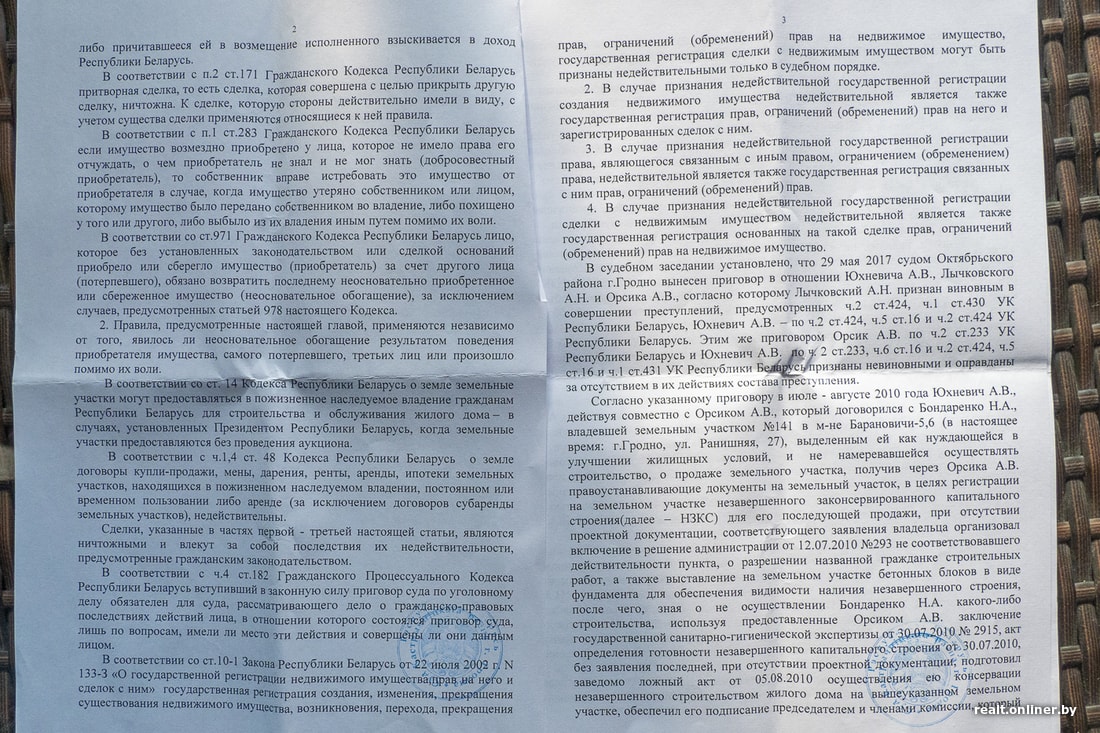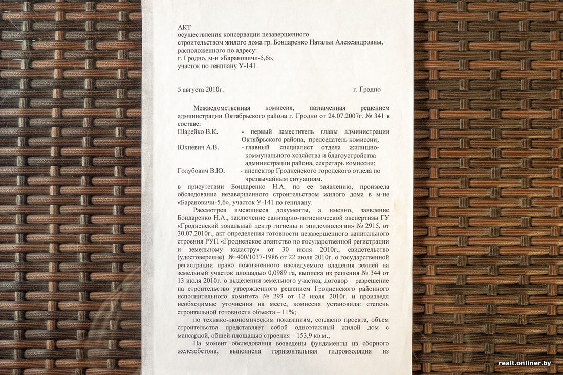 — Поехал я опять в «Барановичи», нашел нужный участок. Смотреть там особо нечего было: земля, на которой стоял фундамент под небольшой дом прямоугольной формы. Но место понравилось, да и цена в 8 000 000 устроила. Оптимизм внушало еще и участие в процессе профильного сотрудника исполкома — уж он-то знает всю историю участка, как правильно оформлять документы, и не допустит, чтобы по юридической части что-то пошло не так. Поэтому, посоветовавшись с родственниками и друзьями, решил, что надо оформлять сделку. После моего «да» на той стороне начали оформлять все необходимые документы.