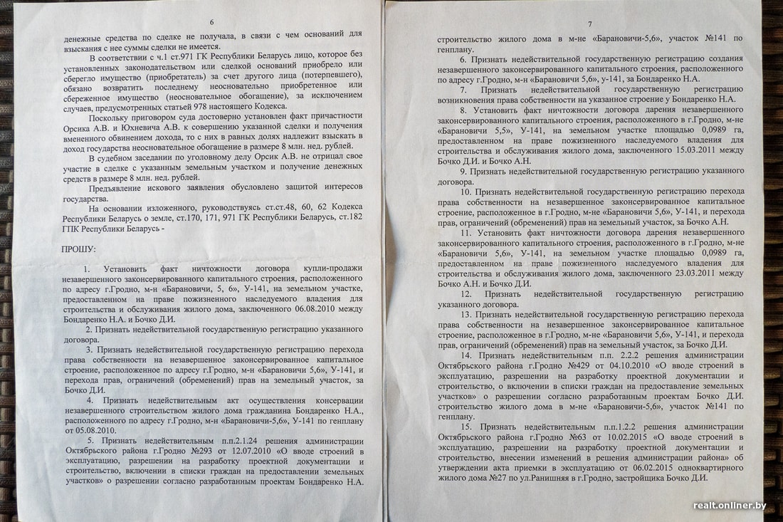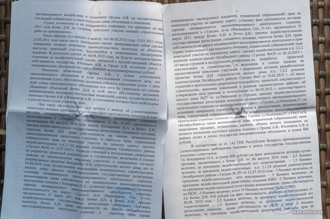 — Весной этого года я стал ответчиком по делу. Прокурор города Гродно в интересах государства подал исковое заявление: отменить все сделки по объекту — купля-продажа, госрегистрация, переоформление, разрешение на строительство, ввод дома в эксплуатацию и т. д. То есть, по сути, отменить всю мою жизнь за последние девять лет. Как это объяснили? Очень просто: хоть Александр Орсик и был оправдан, но в процессе разбирательств было установлено, что он «мутил» с документами, поэтому будь добр, верни землю.