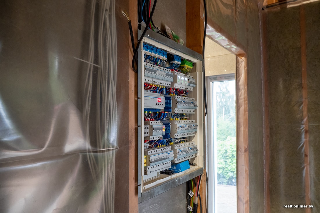Что интересно, в утеплителе никакой электропроводки нет. Чтобы лишний раз не нарушать герметичность пароизоляции, кабели прокладывались в полостях двутавровых балок перекрытия, а затем опускались в замкнутой воздушной прослойке, образованной посредством обрешетки бруском 45×45. Впоследствии таким же образом по дому разводился водопровод, канализация и вентиляция.