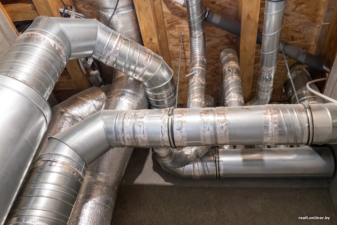 Зашитый в пленку дом словно термос. Нагретый воздух никуда не ускользает, но и свежему дуновению взяться неоткуда. «Каркасник» Кирилла оборудован системой принудительной вентиляции с рекуперацией (выходящий из помещения воздух передает свое тепло поступающему с улицы).
