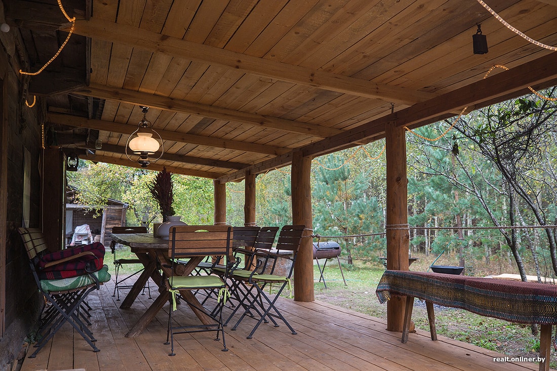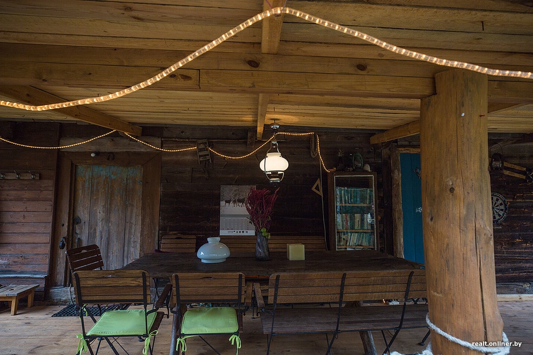 Во втором, гостевом доме декор подобран с некоторым отступлением от строгих белорусских мотивов к стилю бохо: центром интерьера стал индийский ковер со слонами, а у входа нашлась рамка с англоязычной надписью, гласящая, что жизнь начинается там, где заканчивается зона комфорта. К гостевому дому примыкает достроенная Серегой терраса с обеденным столом, абажуром и елочной гирляндой.