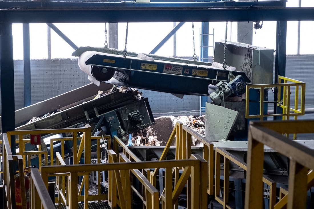 Измельченная мусорная масса отправляется в основной зал, где ее еще раз крошат и распределяют на конвейерные ленты. В главном помещении, где из мусора делают деньги, все шумит и трясется — атмосфера явно не для нежных душ, но что поделаешь, даже самые нежные души оставляют после себя горы мусора, которые надо перерабатывать.