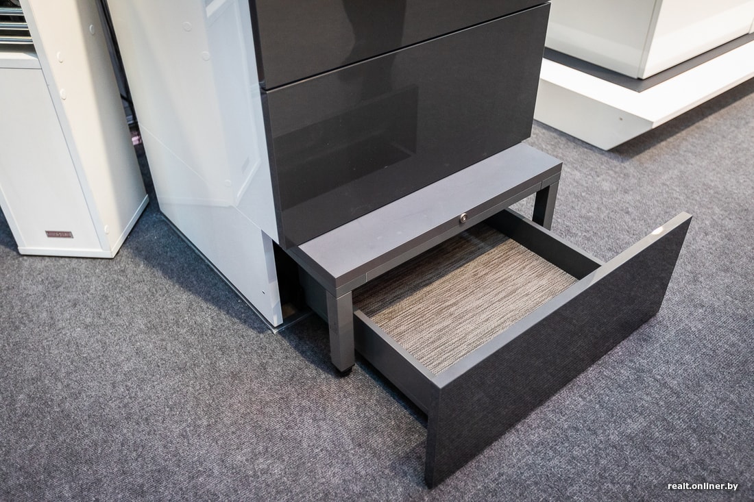 Раз уж мы посмотрели на кухни, узнаем, что новенького в мире фурнитуры. Большой павильон Blum позволяет изучить-потрогать, проверить на прочность все известные системы. Из любопытного — space step.
