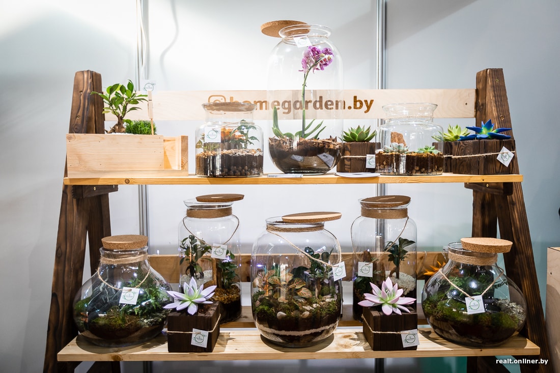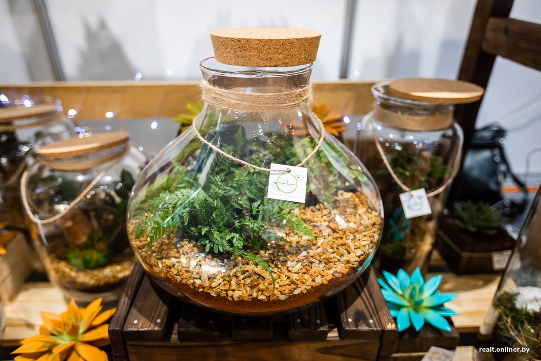 Информация для любителей растений: на выставке можно посмотреть на флорариумы — миниатюрные сады в стеклянном сосуде. «Все растения живые, настоящие, ничего искусственного нет. Это закрытая экосистема, которая сама себя регулирует. Вам надо только следить за уровнем влажности: если на стенках сосуда собирается много капель воды, надо открыть крышку. Если же, наоборот, рано утром или поздно вечером «росы» вообще нет, то флорариум надо немного полить. Все остальное растения сделают сами», — объясняет консультант. Стоят «огородики» от 70 до 185 рублей.