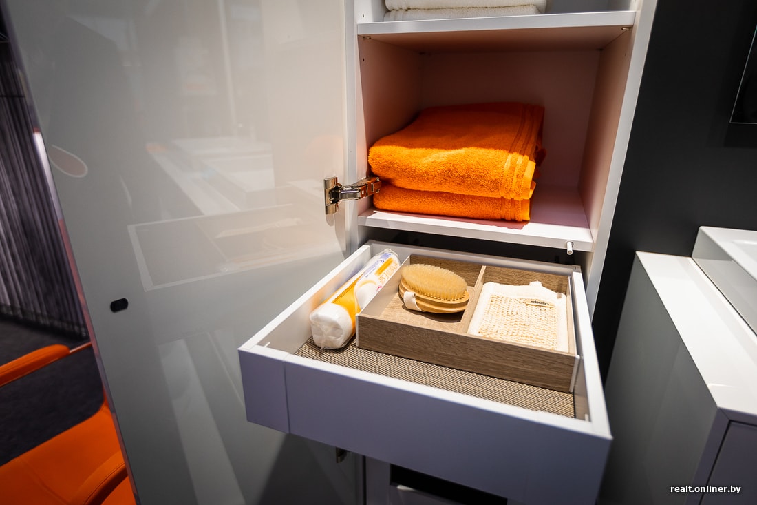 — Зачастую мебель проектируют высокую, до самого потолка. Это модно, красиво, но для людей небольшого роста может представлять неудобства — как дотянуться до верхней полки. Для решения этой проблемы и была придумана система space step. Нижняя полка выдвигается и становится ступенькой. Система выдерживает вес до 150 килограммов, если верхнюю часть сдвинуть, то мы получим еще одно место хранения.