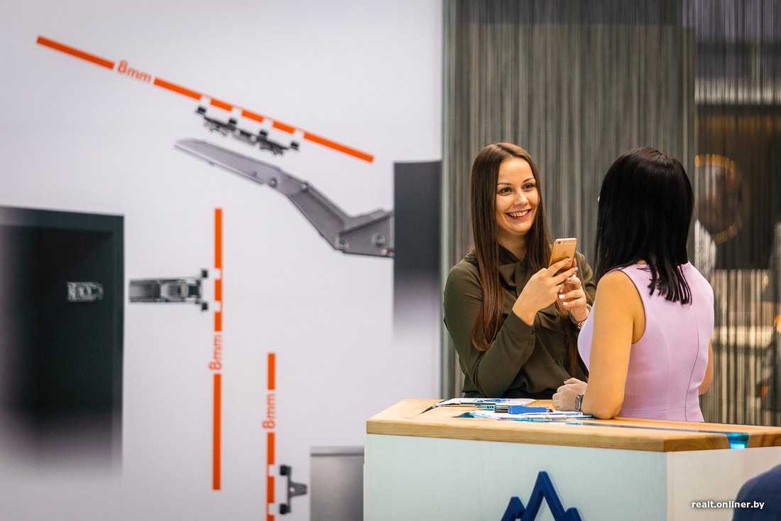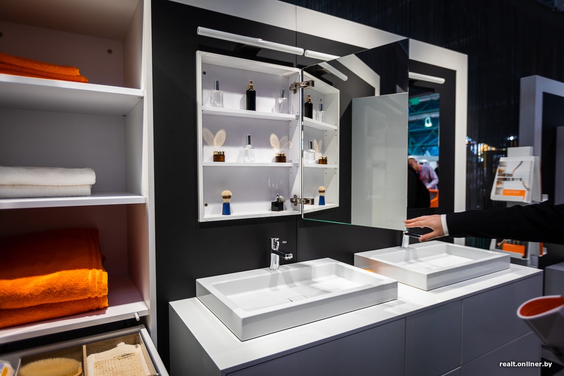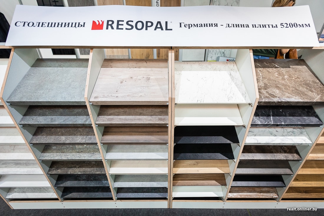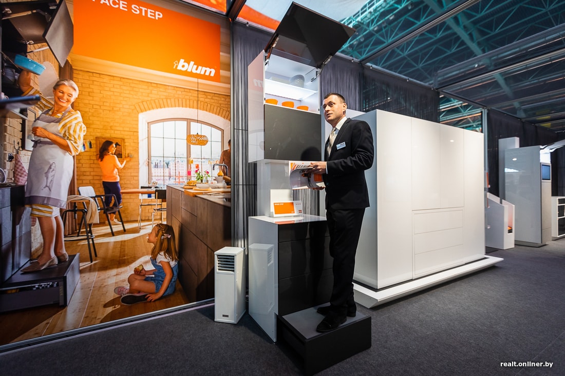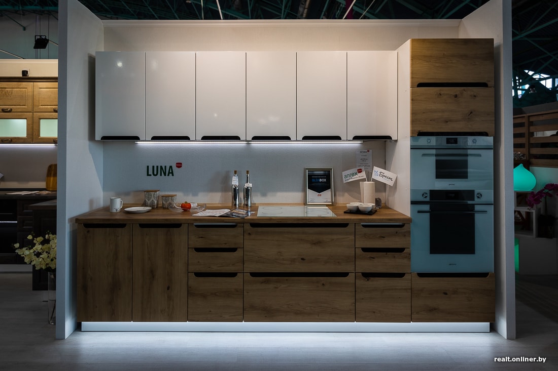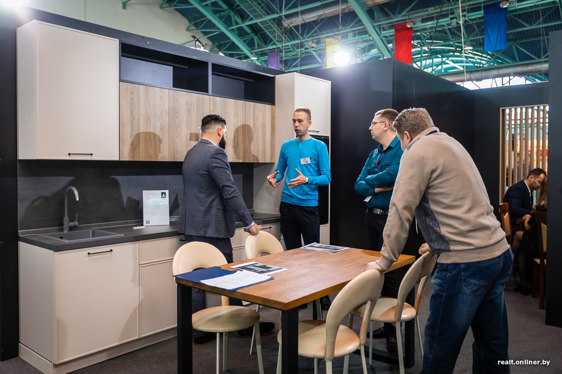 Поговорим о кухнях. Сразу несколько производителей представили свои работы: от крайне бюджетных до неприлично дорогих. Впрочем, на смелые цветовые и дизайнерские решения соглашаются пока немногие белорусы (и дело не только в бюджете).