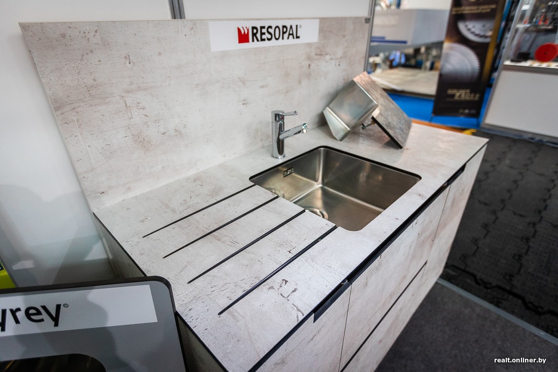 В столешницу Resopal можно монтировать врезные мойки (под «столешку» или же вровень с ней). Такая HPL-плита стоит почти вдвое дешевле, чем столешница из настоящего или искусственного камня. Есть складские и заказные позиции.