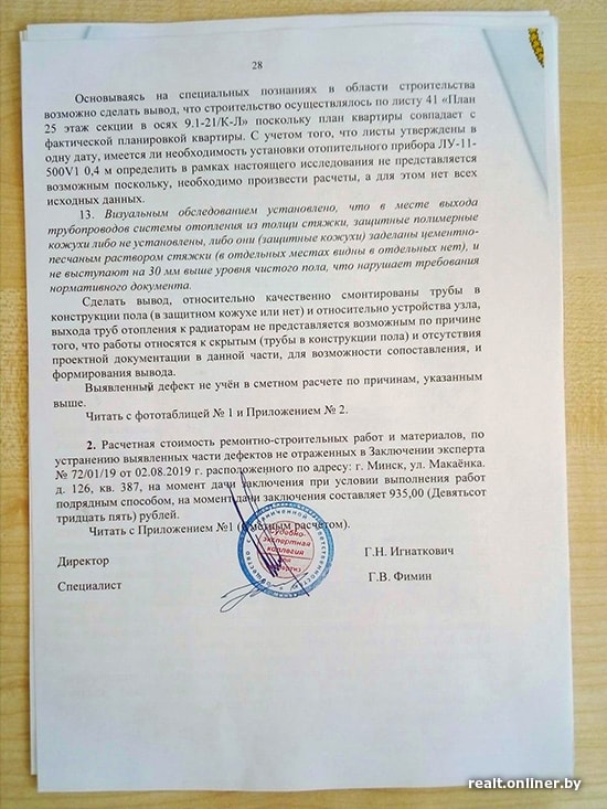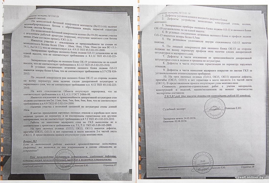 Все эти козыри Татьяна открыла на суде. Суд подумал-подумал и назначил экспертизу. Девушка говорит, что по просьбе застройщика выполнить работу поручили компании «ПравитЭксперт». Специалисту надо было найти ответы на два вопроса: «Соответствуют ли выполненные работы по объекту строительства установленным требованиям ТНПА, в том числе требованиям договора и приложениям к нему?» и «Если в выполненной работе имеются производственные недостатки, то являются ли они устранимыми и какова стоимость их устранения?».