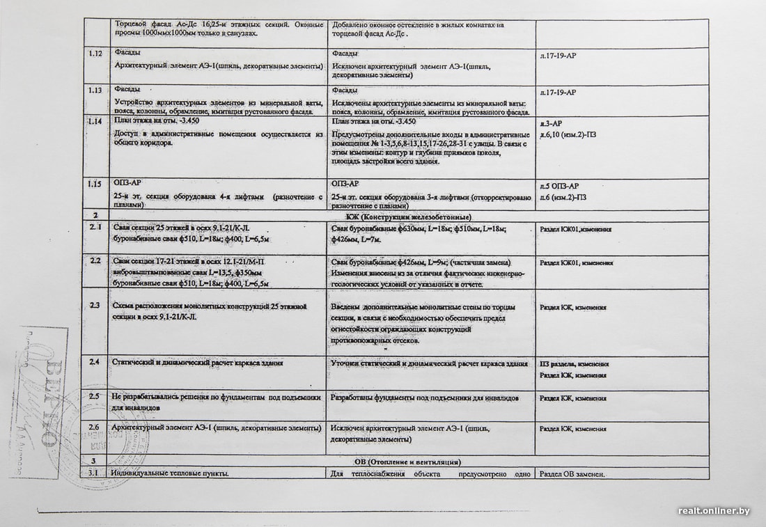 Все изменения, которые произошли с объектом в 2018 году (по сравнению с 2015-м), сведены в многостраничную таблицу. Тут тебе и появление строительных норм Москвы, а также исключение из проекта шпиля и декоративных элементов фасада, пропажа четвертого лифта в 25-этажной секции, отказ от установки застройщиком поквартирных тепловых счетчиков и множество технических нюансов. К слову, про изменение высоты потолка последнего этажа нет ни слова, как и про исчезновение французского балкона на верхних этажах. Получается, в этой части изменения не вносились? Почему же тогда в пентхаусе 2,7 метра и ни одного намека на Францию?