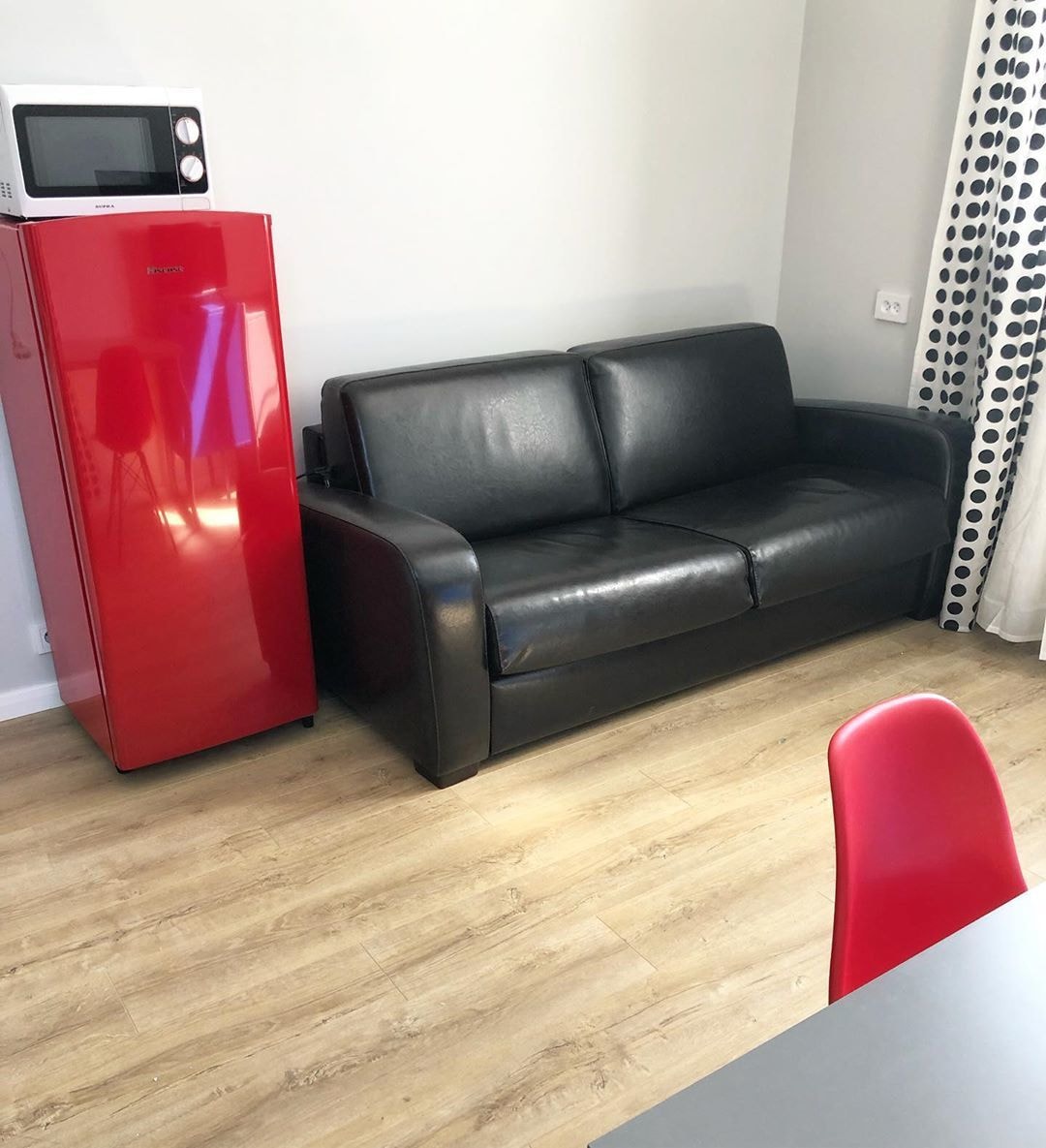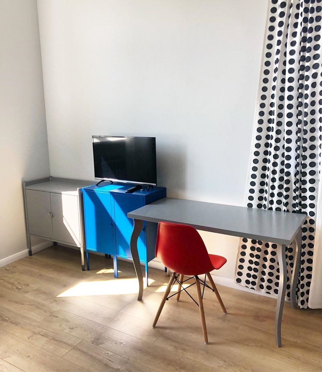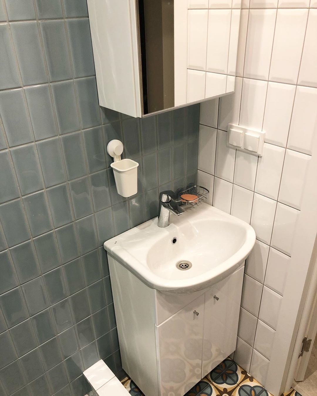На нижнем ярусе хозяева соорудили полноценный санузел с туалетом, душевой и раковиной площадью всего 3 кв. м. Прямо за ним идет кухонный уголок минимальных размеров: электроплита с вытяжкой, раковина, крохотная рабочая поверхность и отдельно стоящий холодильник. Все оставшееся пространство превратили в гостиную зону: здесь стоит небольшой диван, рабочий стол и телевизор. С точки зрения дизайна Наталья особо не мудрствовала: почти вся мебель, включая кухню, куплена в IKEA.