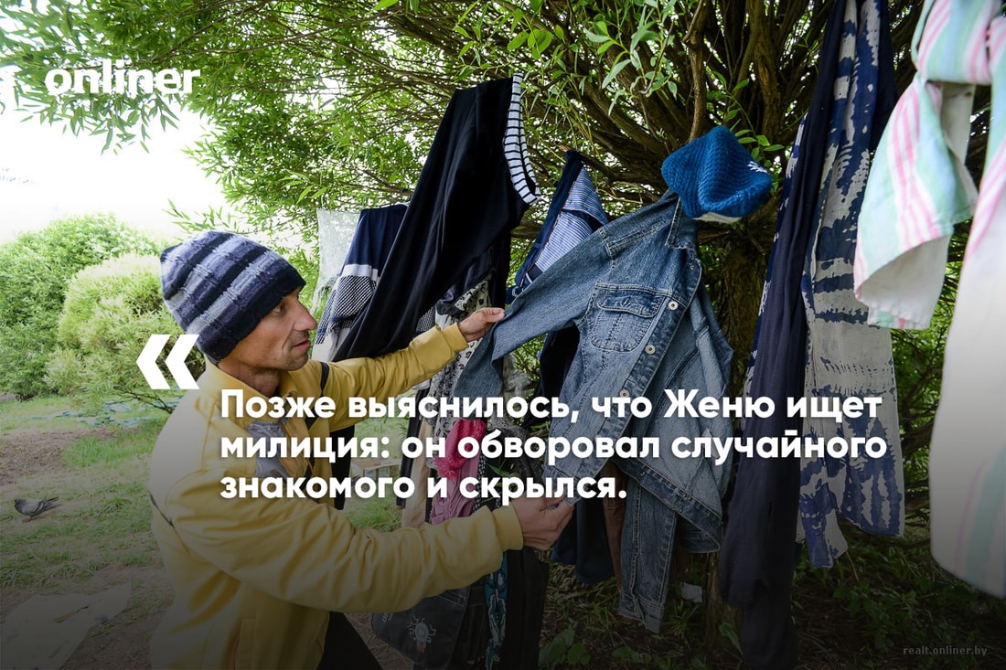 — А мы как-то так, не очень. Тогда что произошло, что случилось? — Евгений Иванович сразу же пытается объясниться и начинает сбивчивый рассказ о событиях того времени. — Вы пытались помочь. У моей жены тогда не было документов, и ее посадили на полгода на Окрестина. Мне-то ничего, я на работу пошел. Мне помогали, приезжали из могилевского банка даже. Я на работу устроился, мне было хорошо. Я знал, что не пропаду. Люди мне стали помогать, денежку начал более или менее собирать — на покушать, за жилье заплатить. Оттуда [из шалаша] мне сказали уходить, поломали все.