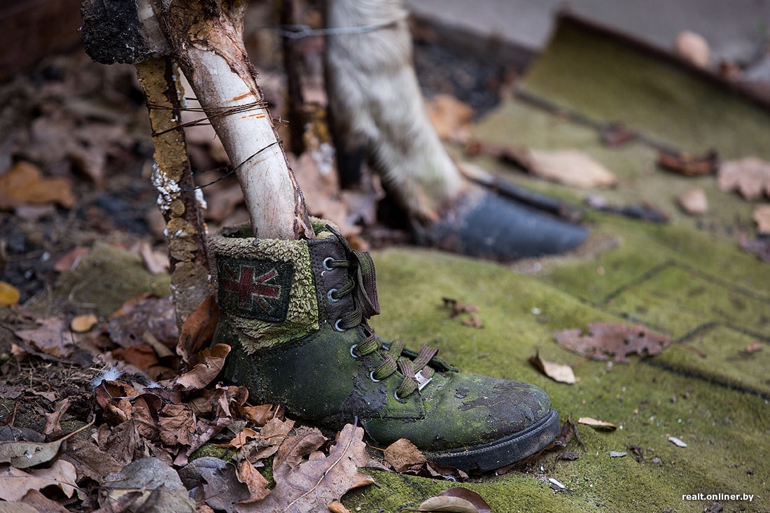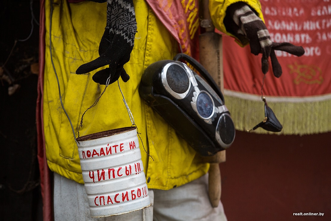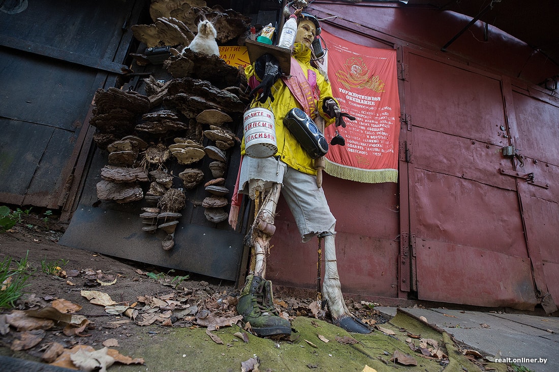 Эта инсталляция могла бы украсить байкерский слет, флэт панков или районный музей современного искусства, но находится рядом с гаражом в частном секторе Масюковщины и почти никому не ведома. Здесь все переплетено: вымпелы с Лениным и клятвами пионеров, четки с православным крестом, «дьявольские» копыта и «оккультные» черепа диких животных. И хотя жители окрестных домов не поднимают панику и не называют автора сектантом, такой креатив выглядит позабористее «ангела смерти». Ничего удивительного, что чучело становилось жертвой вандалов и цензоров. Мы нашли автора этого арт-объекта и спросили, что он хотел всем этим сказать.