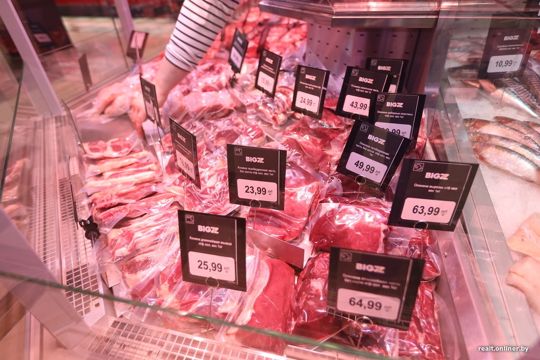 В специальном шкафу уже зреет говядина. Пока самый бюджетный сорт стоит 39 рублей, а самый дорогой — почти 160. Примерно через месяц будет готово и белорусское мясо, но цен на него пока нет.