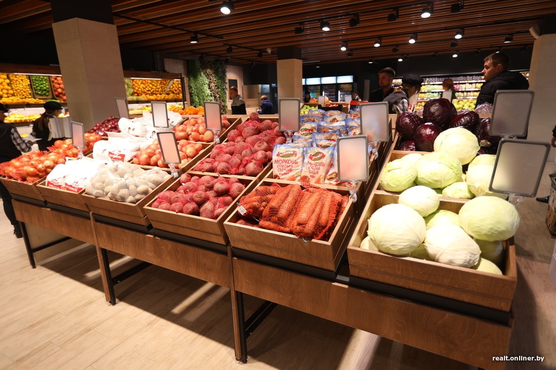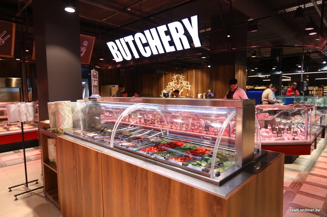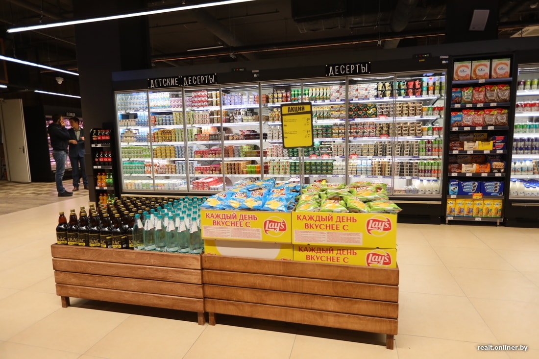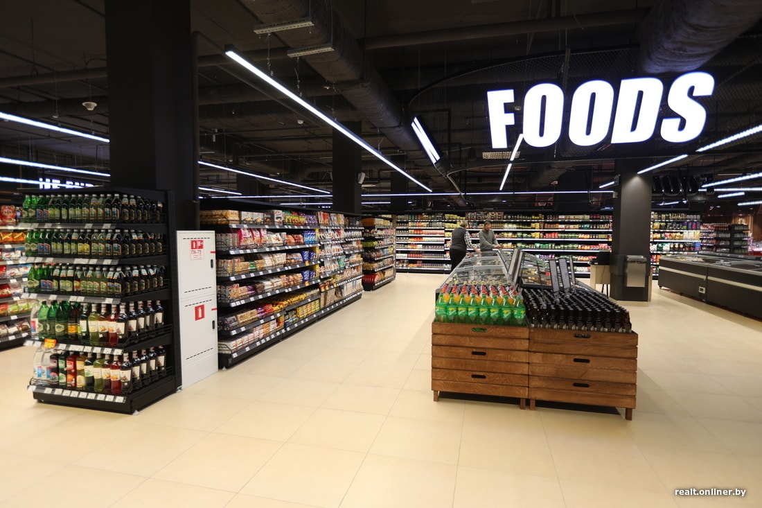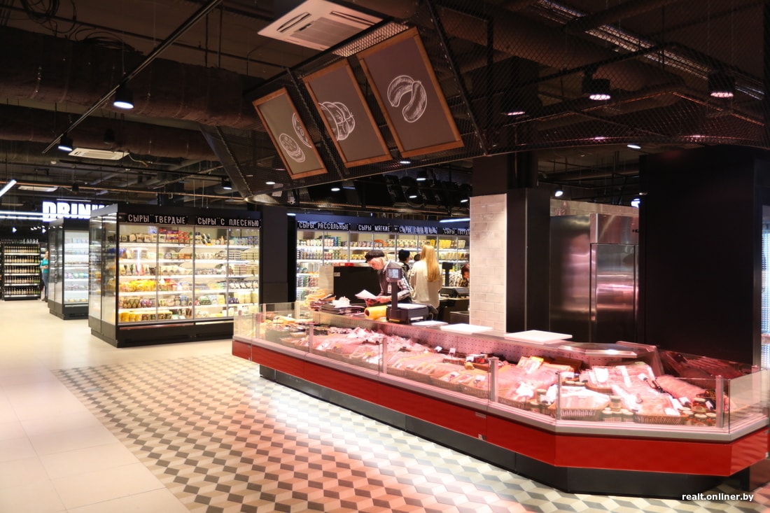 Магазин находится на нулевом уровне (спуститься вниз можно на эскалаторе), он занимает 3000 «квадратов». Кроме стандартного набора продуктов, здесь предлагают много интересных позиций для обеспеченных белорусов. Есть колючие крабы и устрицы.