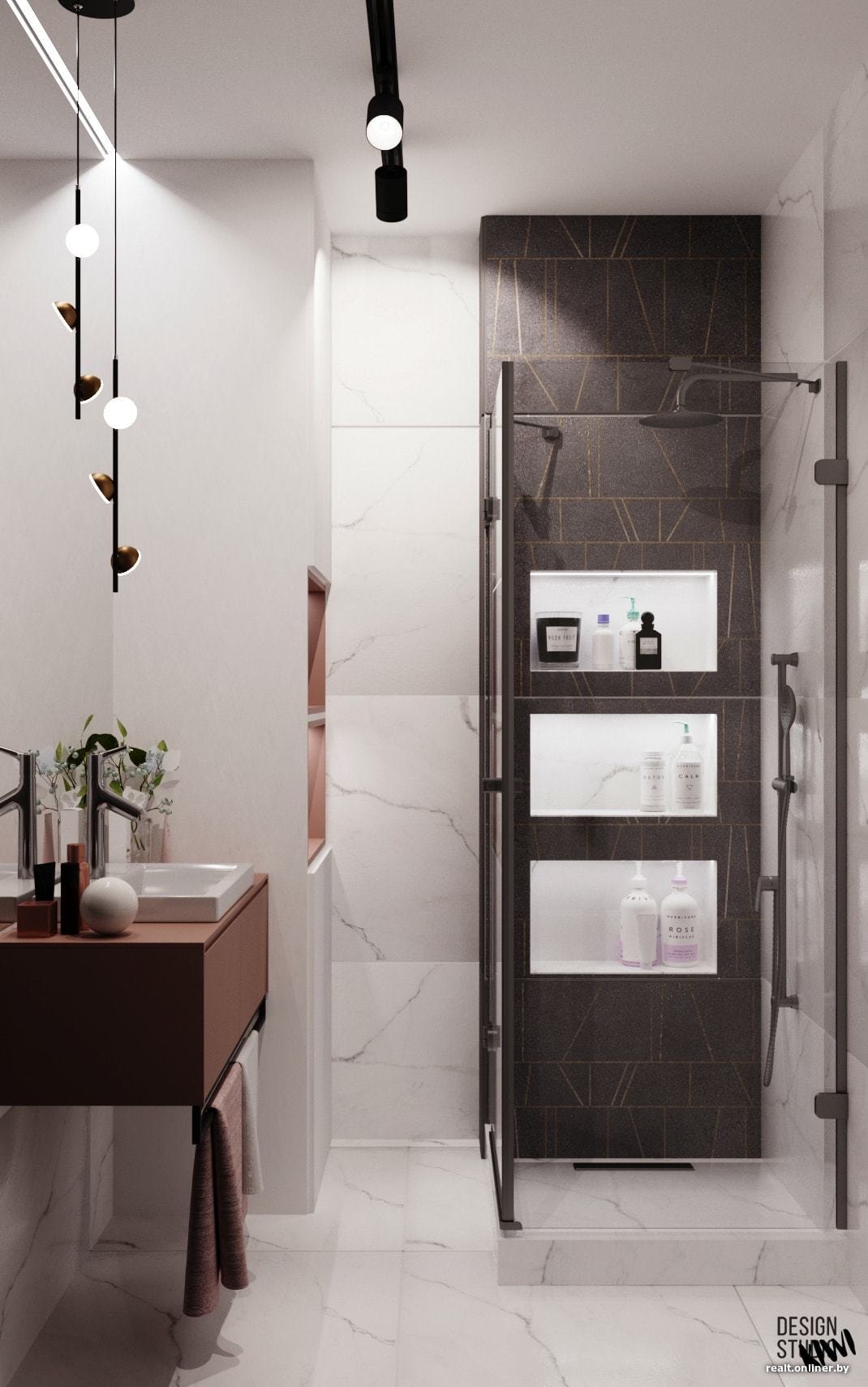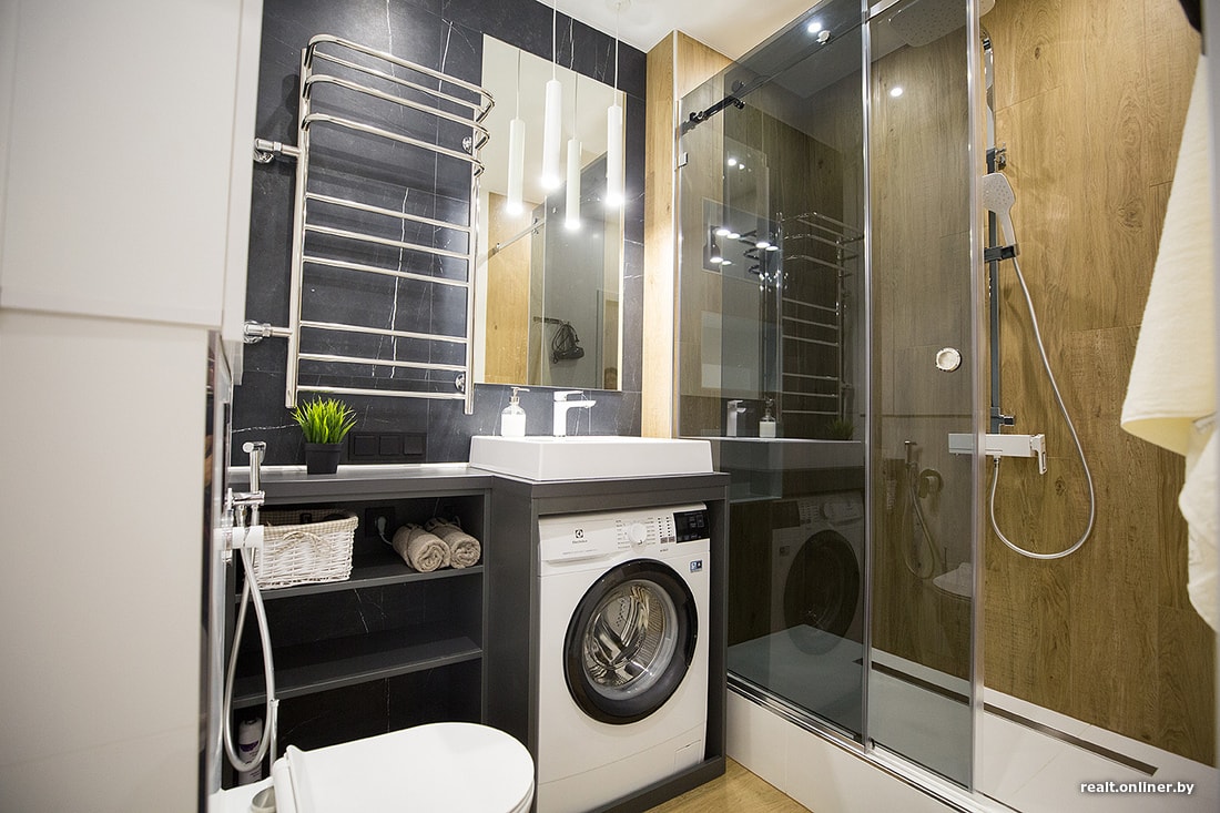 Больше всего от первоначальной концепции отличается санузел. Он стал светлее. Плитка в душевой кабине имитирует деревянную, так что не волнуйтесь, это не дерево, оно не намокнет.