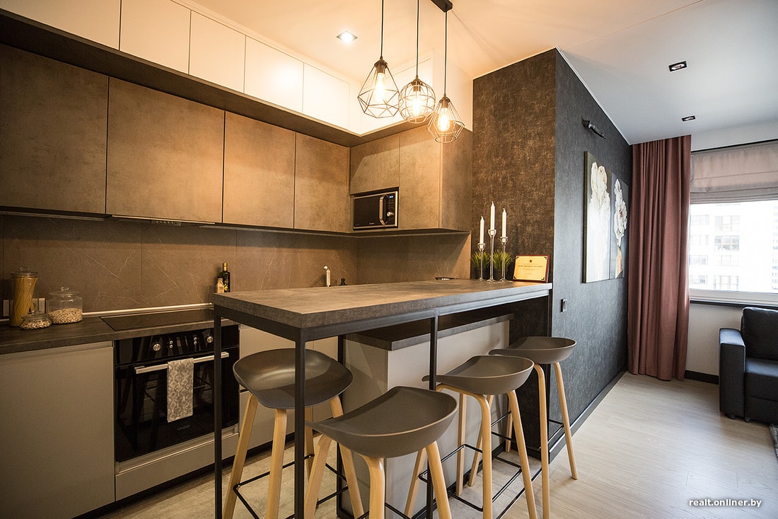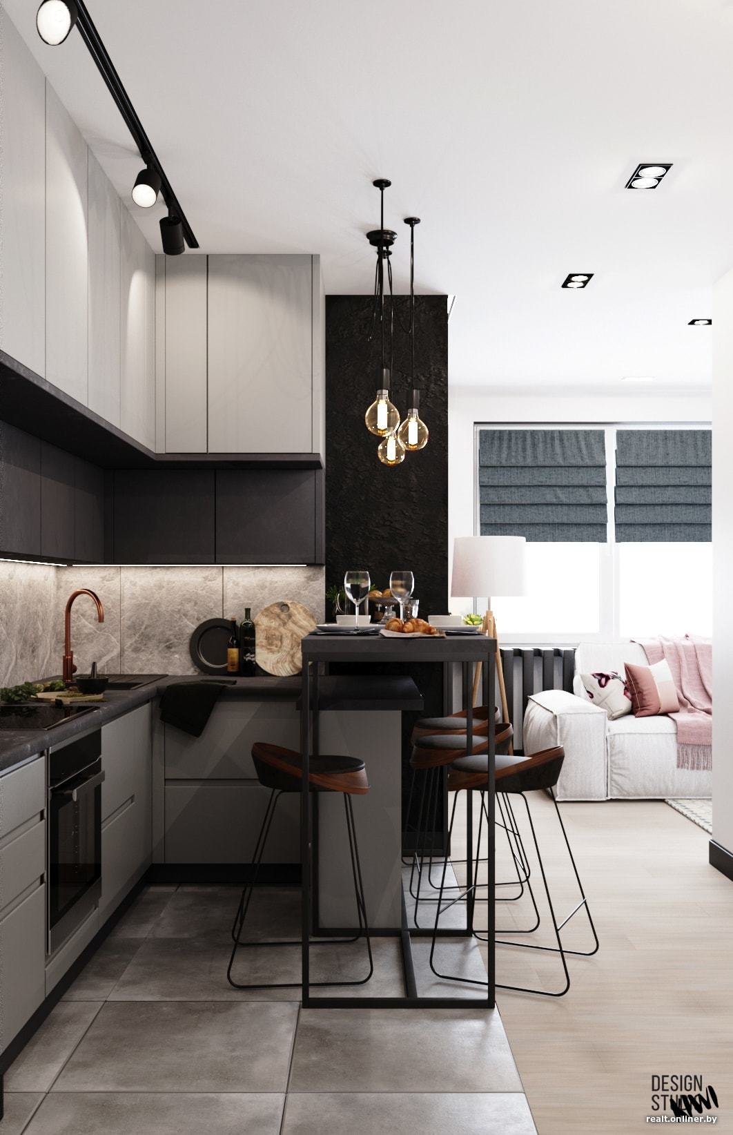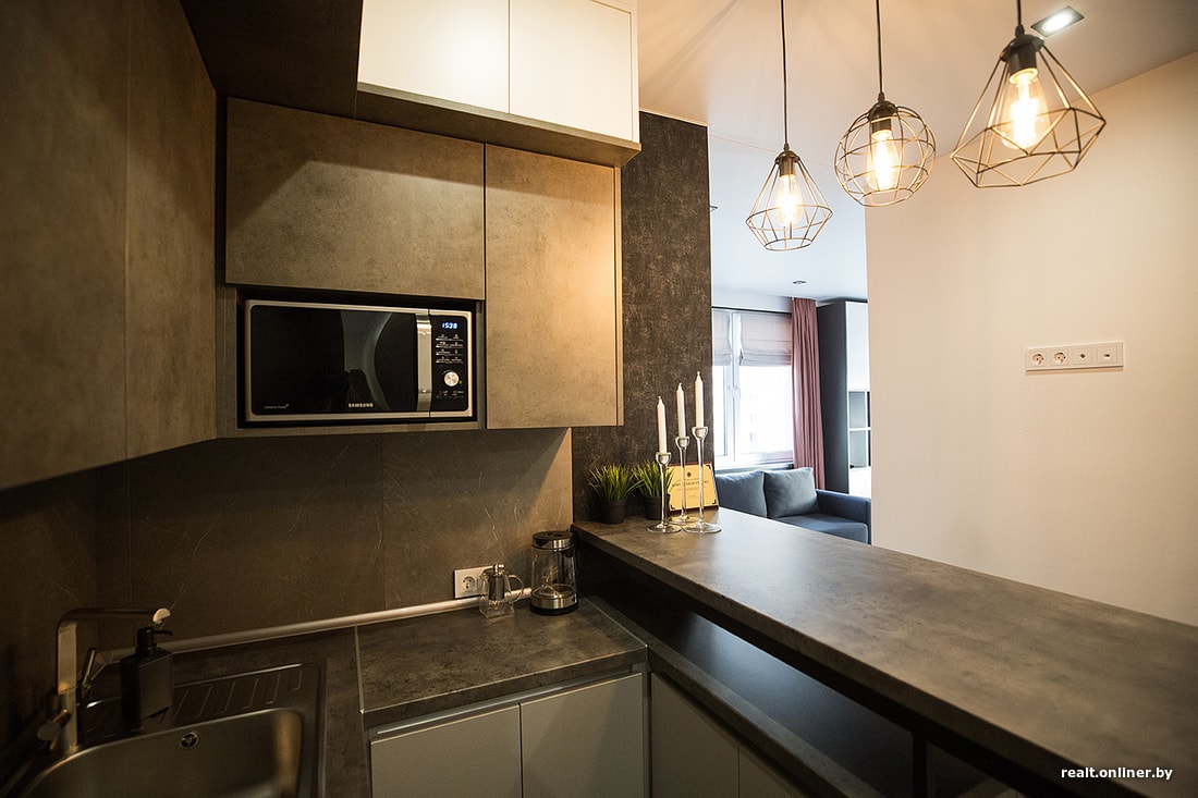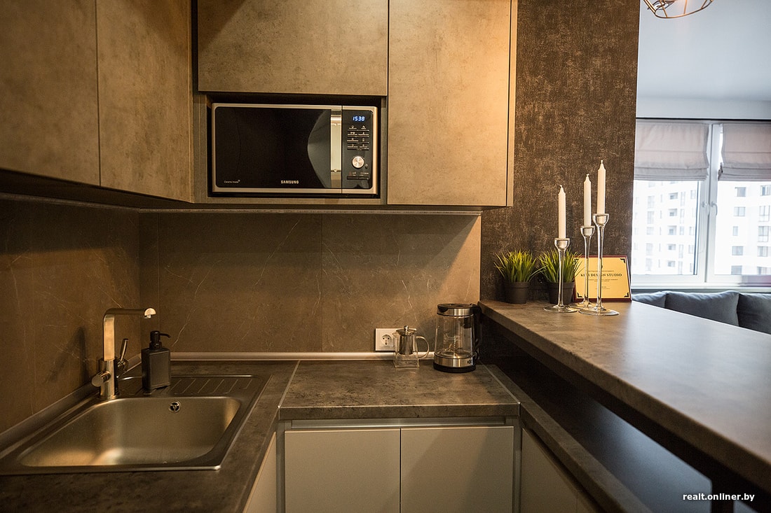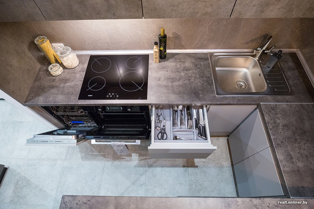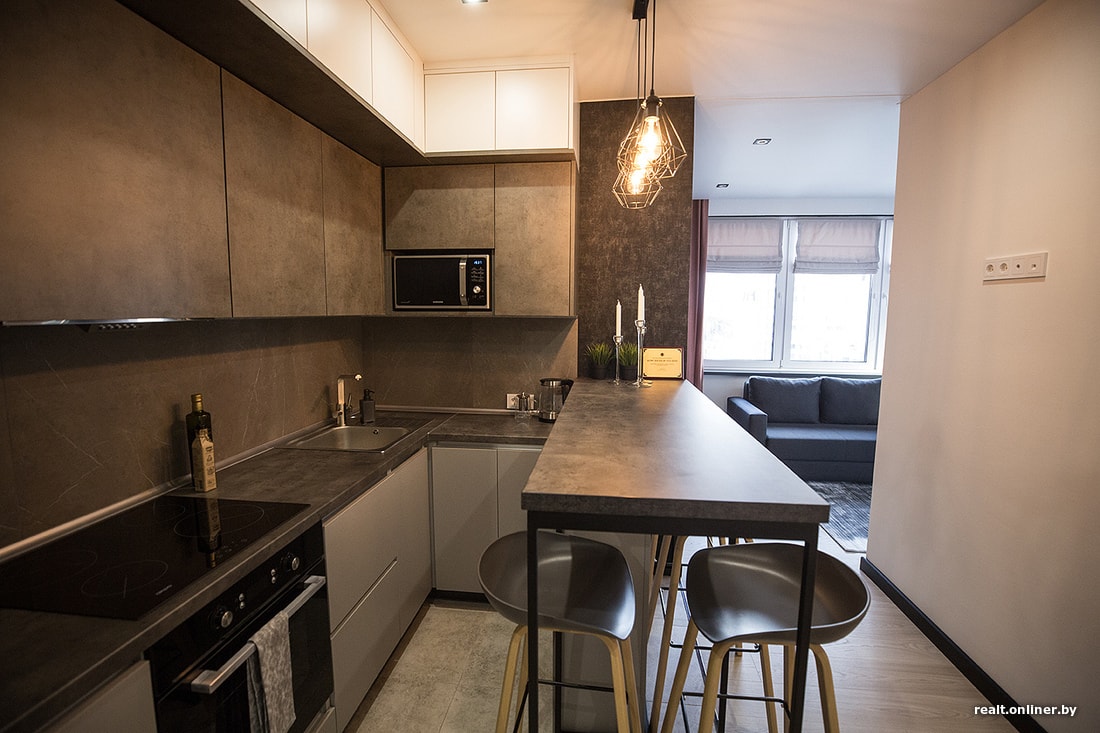 Кухня осталась без изменений, не считая того, что высоту шкафчиков подогнали под новых хозяев. Графитовые элементы сочетаются со стеной в гостиной и создают иллюзию ее продолжения. Зона кухни вроде и небольшая, но составлена очень грамотно и вмещает в себя все необходимое.