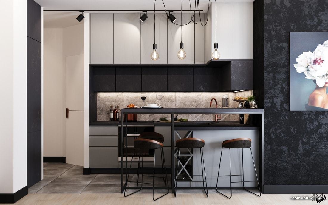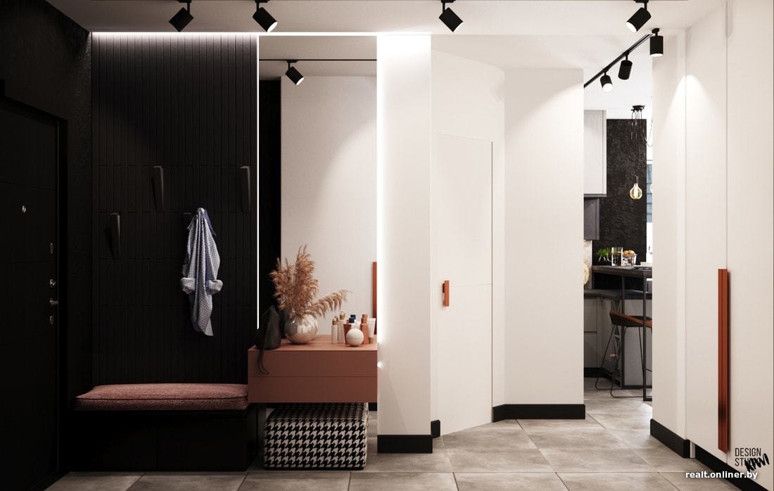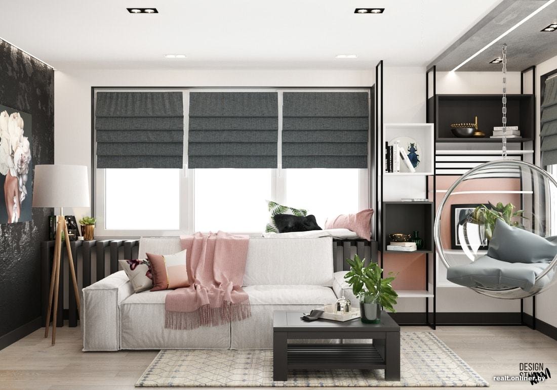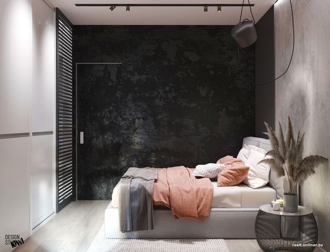 — Нашими заказчиками в проекте были молодые ребята 23 и 24 лет. Вкус у них хороший: они хотели современный дизайн в стиле минимализма и лофта, больше бетона и серого цвета. Что касается акцентных цветов, они не могли определиться с ними, поэтому мы сами добавили в интерьер коралловый. При этом мы предложили максимально современные элементы: трековые системы, подвесные светильники.