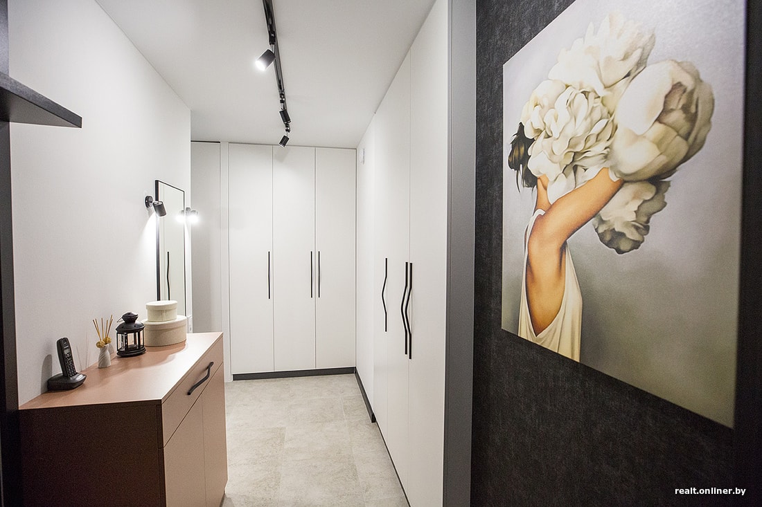 Во входной зоне навесную парящую тумбочку из прежней концепции заменили на тумбу побольше, чтобы прятать туда обувь. Электрощит замаскировали картиной.