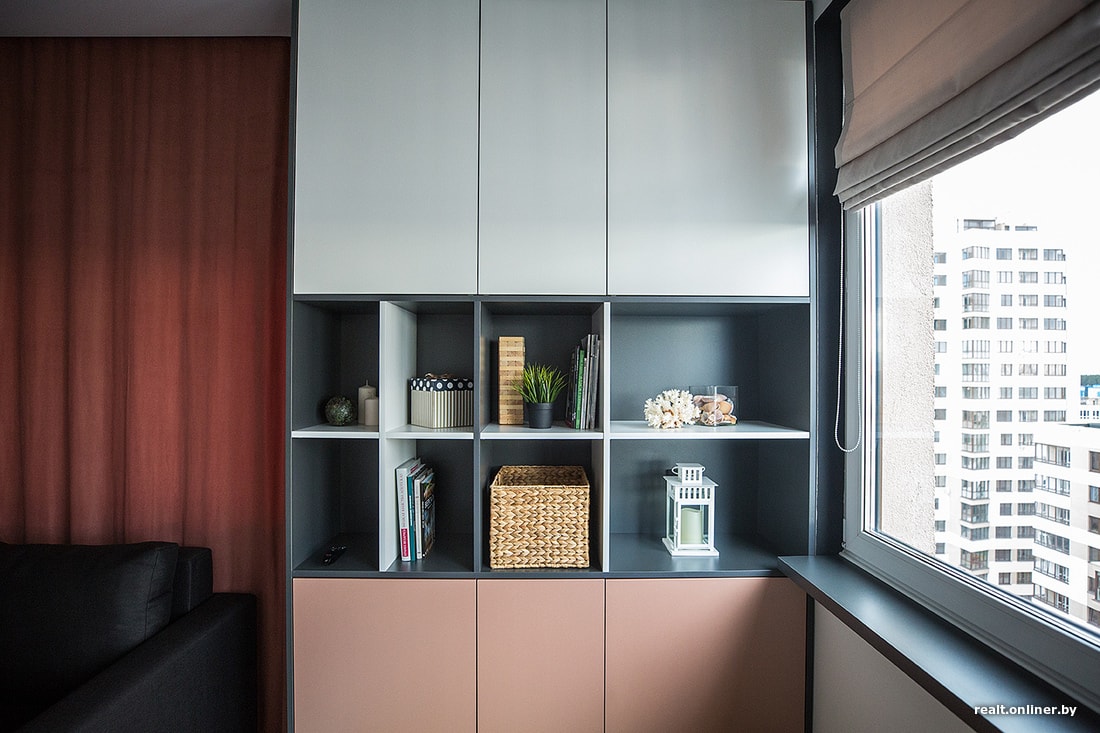В гостиной убрали то самое висящее кресло — оно было мечтой девушки, но не новых заказчиков. Заменили металлический стеллаж на шкаф пофункциональнее. Подоконник сделали самым обычным, хотя в предыдущем проекте на нем можно было сидеть и читать книги. Зато расстояние от дивана и телевизора стало больше. Диван поменял цвет — он, кстати, от белорусского производителя. Нашлось место и для рабочей зоны — вроде и в уголке, но одновременно и возле окна, так что света достаточно.