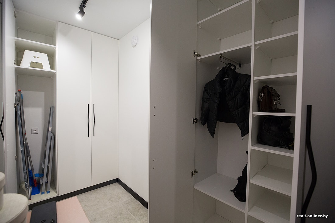 — Шкафы создают впечатление цельной стены, — говорит хозяйка. — Некоторые из них глубокие и очень вместительные. Мы даже мерили длину чемоданов, чтобы они поместились внутрь. Также здесь будут храниться пылесос и гладильная доска.