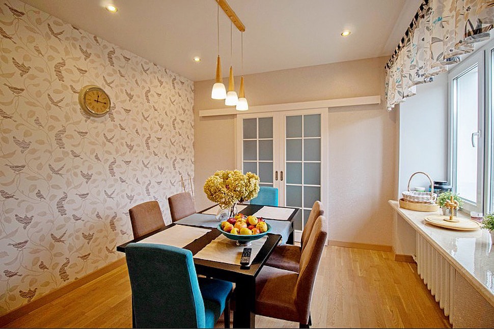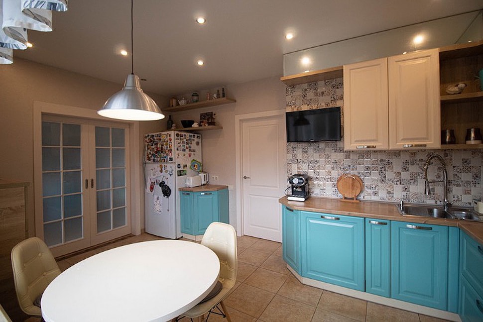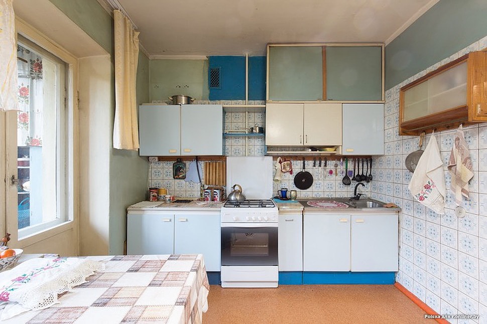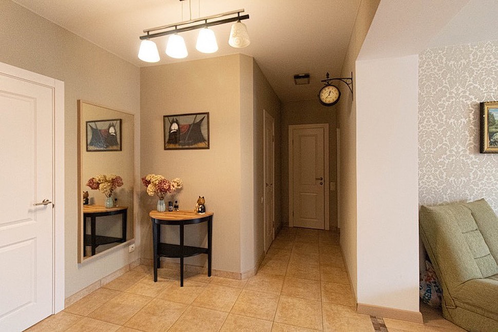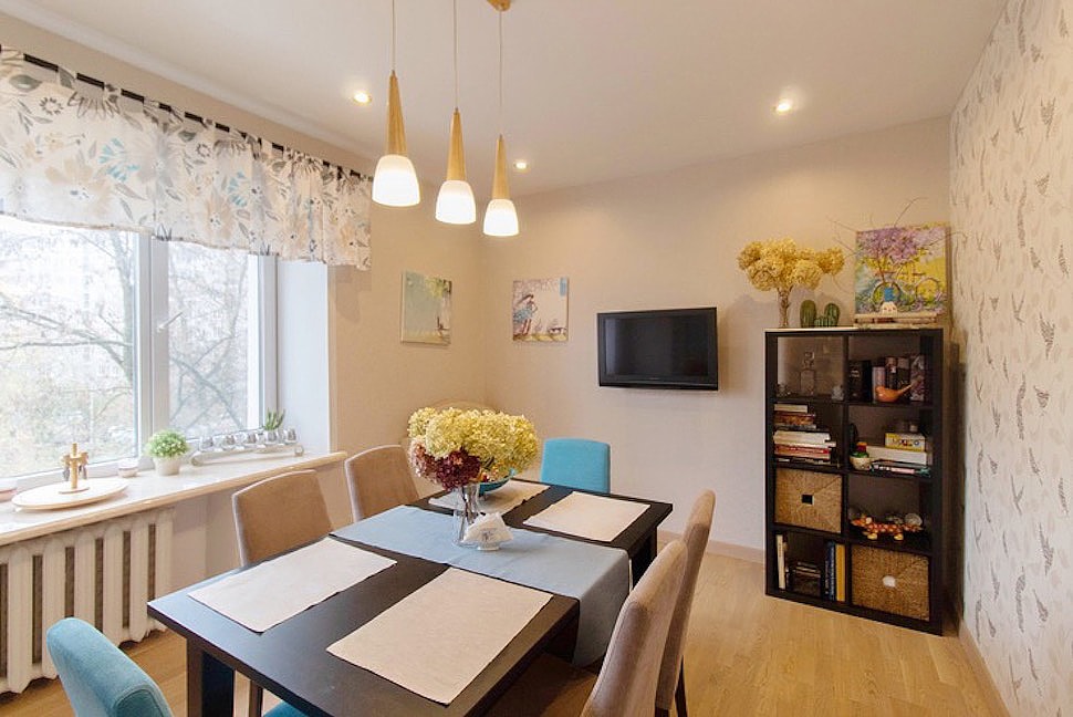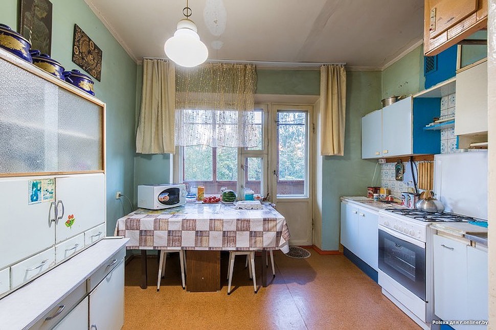 Кухня имеет площадь 11,5 «квадрата», чего вполне достаточно для приготовления еды. Как можно понять по фото, смежную комнату превратили в столовую. Квартира отлично отремонтирована: от конца 70-х не осталось и следа. Но все равно цена одного квадратного метра пугающая — $1975 по курсу.