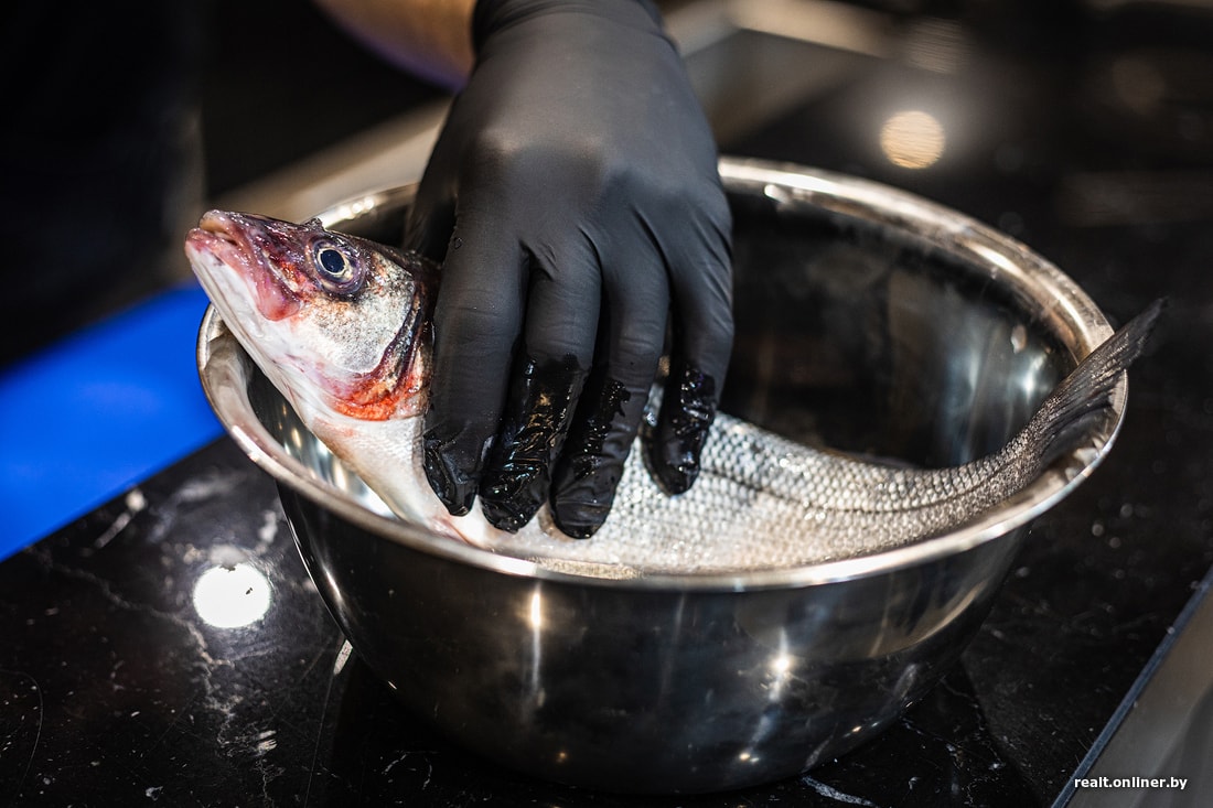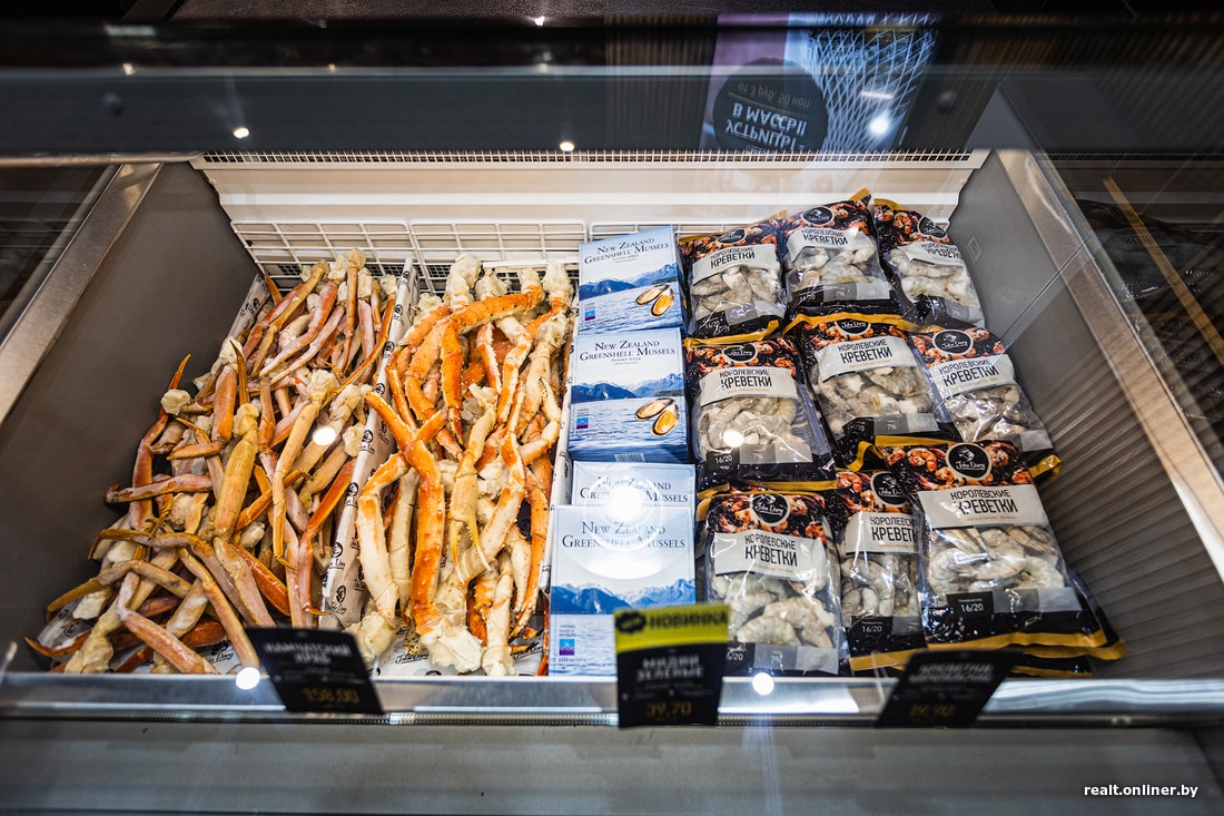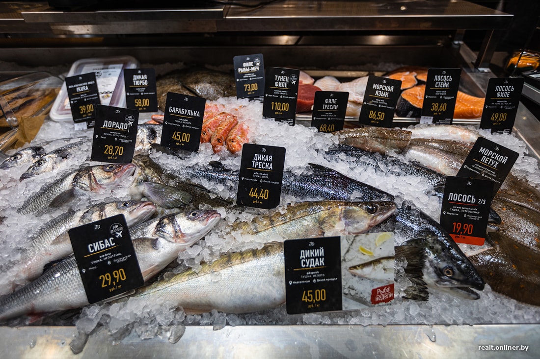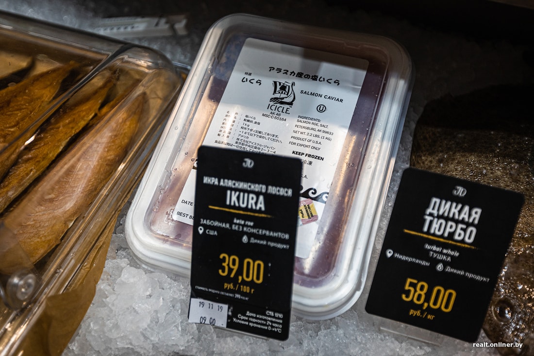 Кроме икры стоимостью 39 рублей за 100 грамм, здесь продают рыбу-барабульку, тушку осьминога, морского петуха, гребешки, филе трески, тунца, рыбы-меч. Продавцы также отмечают устрицы Фин де Бретань стоимость 3,5 рубля за штуку.